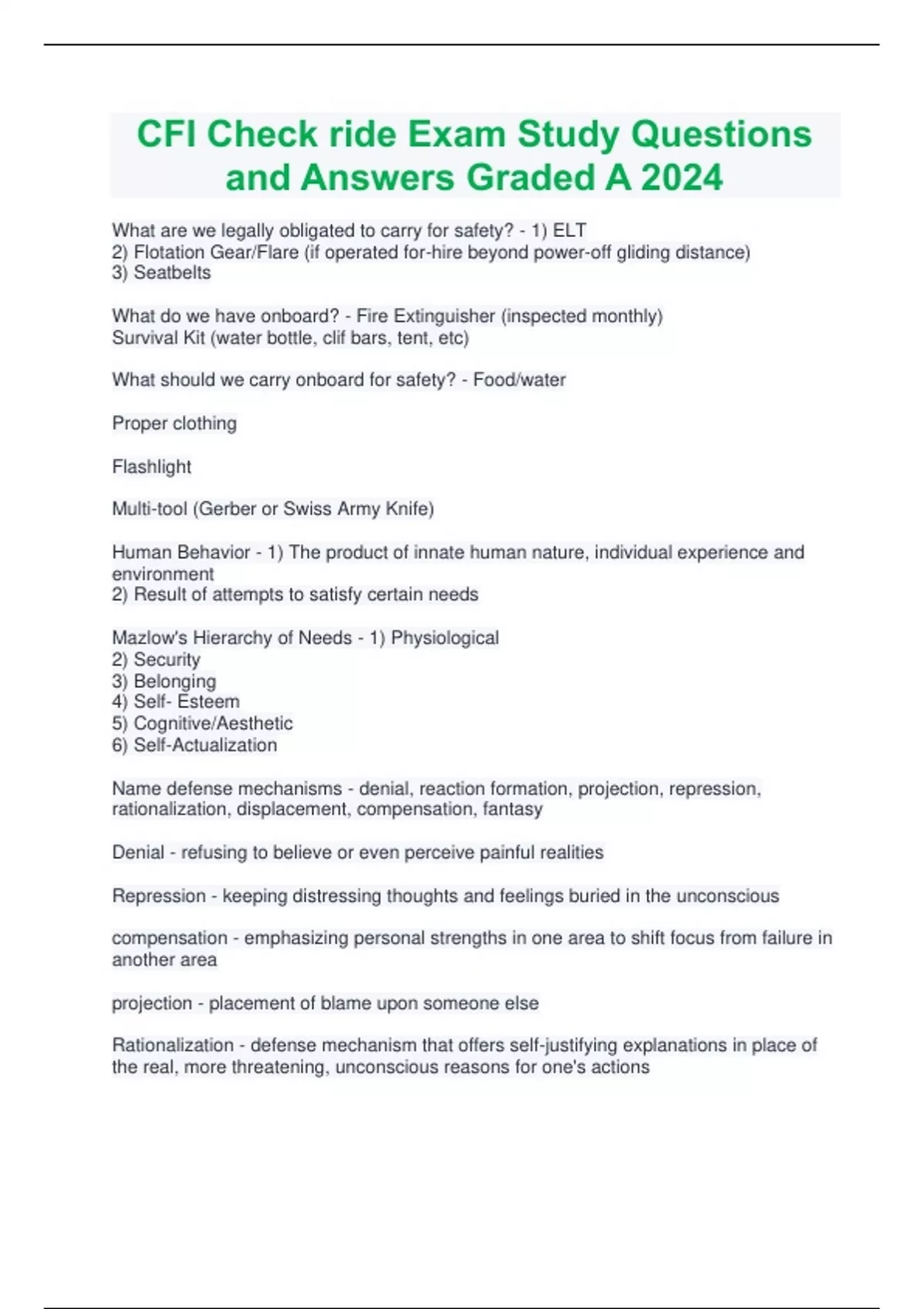 What are we legally obligated to carry for safety? - 1) ELT 2) Flotation Gear/Flare (if operated for-hire beyond power-off gliding distance) 3) Seatbelts What do we have onboard? - Fire Extinguisher (inspected monthly) Survival Kit (water bottle, clif bars, tent, etc) What should we carry onboard for safety? - Food/water Proper clothing Flashlight Multi-tool (Gerber or Swiss Army Knife) Human Behavior - 1) The product of innate human nature, individual experience and environment 2) Result of attempts to satisfy certain needs Mazlow's Hierarchy of Needs - 1) Physiological 2) Security 3) Belonging 4) Self- Esteem 5) Cognitive/Aesthetic 6) Self-Actualization Name defense mechanisms - denial, reaction formation, projection, repression, rationalization, displacement, compensation, fantasy Denial - refusing to believe or even perceive painful realities Repression - keeping distressing thoughts and feelings buried in the unconscious compensation - emphasizing personal strengths in one area to shift focus from failure in another area projection - placement of blame upon someone else Rationalization - defense mechanism that offers self-justifying explanations in place of the real, more threatening, unconscious reasons for one's actions reaction formation - Defense mechanism by which people behave in a way opposite to what their true but anxiety-provoking feelings would dictate. Fantasy - daydream to escape from reality Displacement - Unconscious transfer of unacceptable emotions, thought or feelings from someone to a more acceptable external source Dealing with Student Anxiety - 1) Acknowledge it 2) Introduce maneuvers with care 3) Emphasize pleasurable aspects of flying 4) Introduce safety practices as ways of maintaining efficiency Teaching Older Students - 1) Be more efficient 2) Give more at home responsibilities 3) Give more control over own training Basic Elements of Communication - Source, Symbol, Receiver Barriers to effective communication - Lack of common experience, Confusion between symbol and symbolized object, Overuse of abstractions, Interference Developing Communication Skills - Role playing Instructional communication Listening Questioning Instructional enhancement What is learning? - a relatively permanent change in behavior due to experience Behaviorism - Behavior can be predicted based on previous rewards and punishments (reinforcements) Cognitive Theory - Focuses on the process of thinking and learning. Learning is seen as a change in behavior, thinking understanding, and feeling Higher Order Thinking Skills (HOTS) - Being able to think & process info beyond basic concept memory & recall as well as evaluate and utilize info learned. Perceptions - Come from the five senses, the basis for learning Learning occurs more rapidly when information is received through more than one sense Insight - Grouping of perceptions into a meaningful whole Factors affecting Perceptions/Insights - 1) Physical 2) Goals and Values 3) Self-Concept 4) Time and Opportunity 5) Element of Threat Phases of Knowledge Aquirement - 1) Memorization 2) Understanding 3) Concept Learning Thorndike's Laws of Learning - Readiness Effect Exercise Primacy Intensity Recency Domains of Learning - cognitive, affective, psychomotor Characteristics of learning - Purposeful Result of Experience Multifaceted Active process Stages of skill acquisition - 1. Cognitive 2. Associative 3. Automatic Response Learning Plateau - A period in which progress in learning appears to be at a standstill. Normal and to be expected. Can move student to other part or curriculum Types of Practice - Deliberate Blocked Random Good scenarios... - 1) have a clear objective 2) is tailored to the needs of the student 3) capitalizes on the nuances of the local environment two types of error - Slip Mistake Reducing Error - 1) learning and practice 2) taking time 3) checking for errors 4) reminders