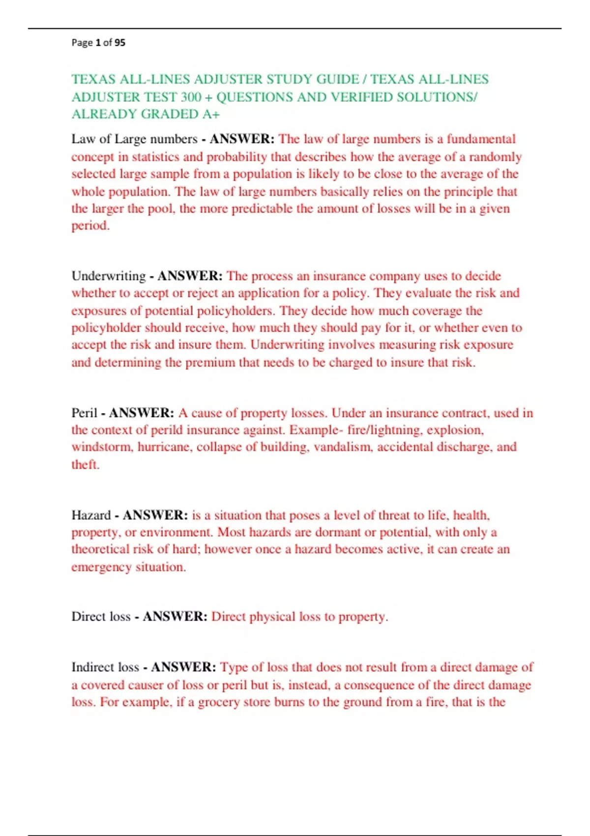 TEXAS ALL-LINES ADJUSTER STUDY GUIDE / TEXAS ALL-LINES ADJUSTER TEST 300 + QUESTIONS AND VERIFIED SOLUTIONS/ ALREADY GRADED A+