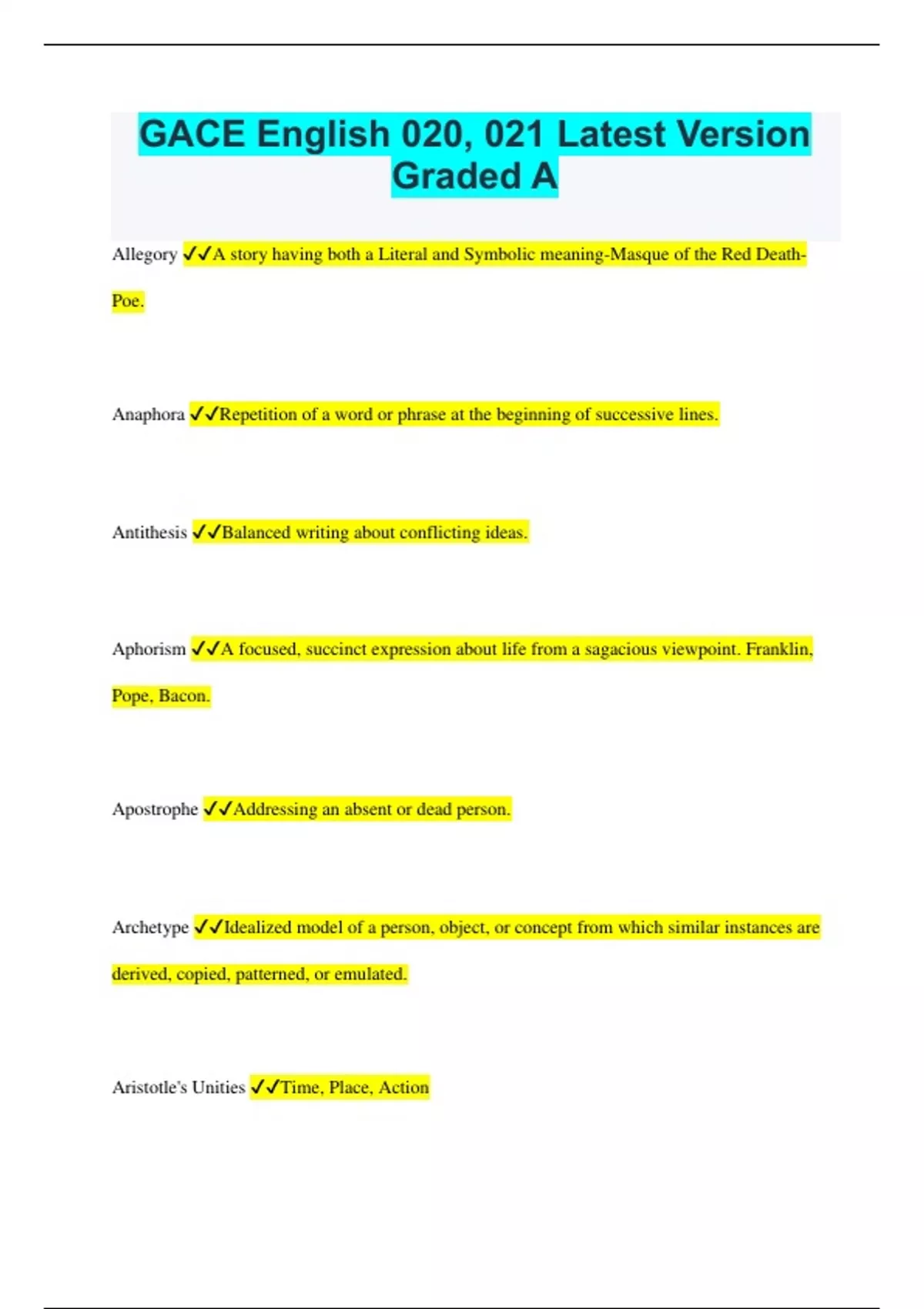 GACE English 020, 021 Latest Version Graded A Allegory A story having both a Literal and Symbolic meaning-Masque of the Red Death- Poe. Anaphora Repetition of a word or phrase at the beginning of successive lines. Antithesis Balanced writing about conflicting ideas. Aphorism A focused, succinct expression about life from a sagacious viewpoint. Franklin, Pope, Bacon. Apostrophe Addressing an absent or dead person. Archetype Idealized model of a person, object, or concept from which similar instances are derived, copied, patterned, or emulated. Aristotle's Unities Time, Place, Action Ballad In Media Res story sung or told in verse and usually accompanied by music. Bandwagon Tries to persuade the reader to do, think, or buy something because it is popular or everyone is doing it Bathos insincere or overly sentimental quality of writing/speech intended to evoke pity Bildungsroman German term signifying "novel of formation" or "novel of education" the coming of age novel Blank verse iambic pentameter, or five feet of iambs Caesura A pause in a line of poetry // Catharsis an emotional purging of a character Children's Lit Became popular second half of 18th century. The Visible World of Pictures by John Amos Comenius. Cinquain A poem with one five-line stanza having no rhyme scheme. Adelaide Crapsey () named it and invented meter. comedy a form of dramatic literature that is meant to amuse and often ends happily Compound Sentence Two clauses connected by a coordinating conjunction. Complex Sentence an independent clause plus one or more dependent clauses. Compound/Complex one or more dependent clauses plus two or more independent clauses. Conceit Comparison between seemingly disparate objects or concepts. Donne's "flea bite to act of love" "The Flea" Coordinating Conjunction FOR, AND, BUT, OR, YET, and SO -- used to join ideas that are similar; remember to use a comma before a conjunction in a compound sentence: Ex: Craig gets in trouble, BUT he usually gets out of it. Correlative Conjunction EITHER/OR, NEITHER/NOR, BOTH/AND join pairs of ideas Critical thinking tools Summarization, question generation, and textual marking Deductive Reasoning Reasons general
