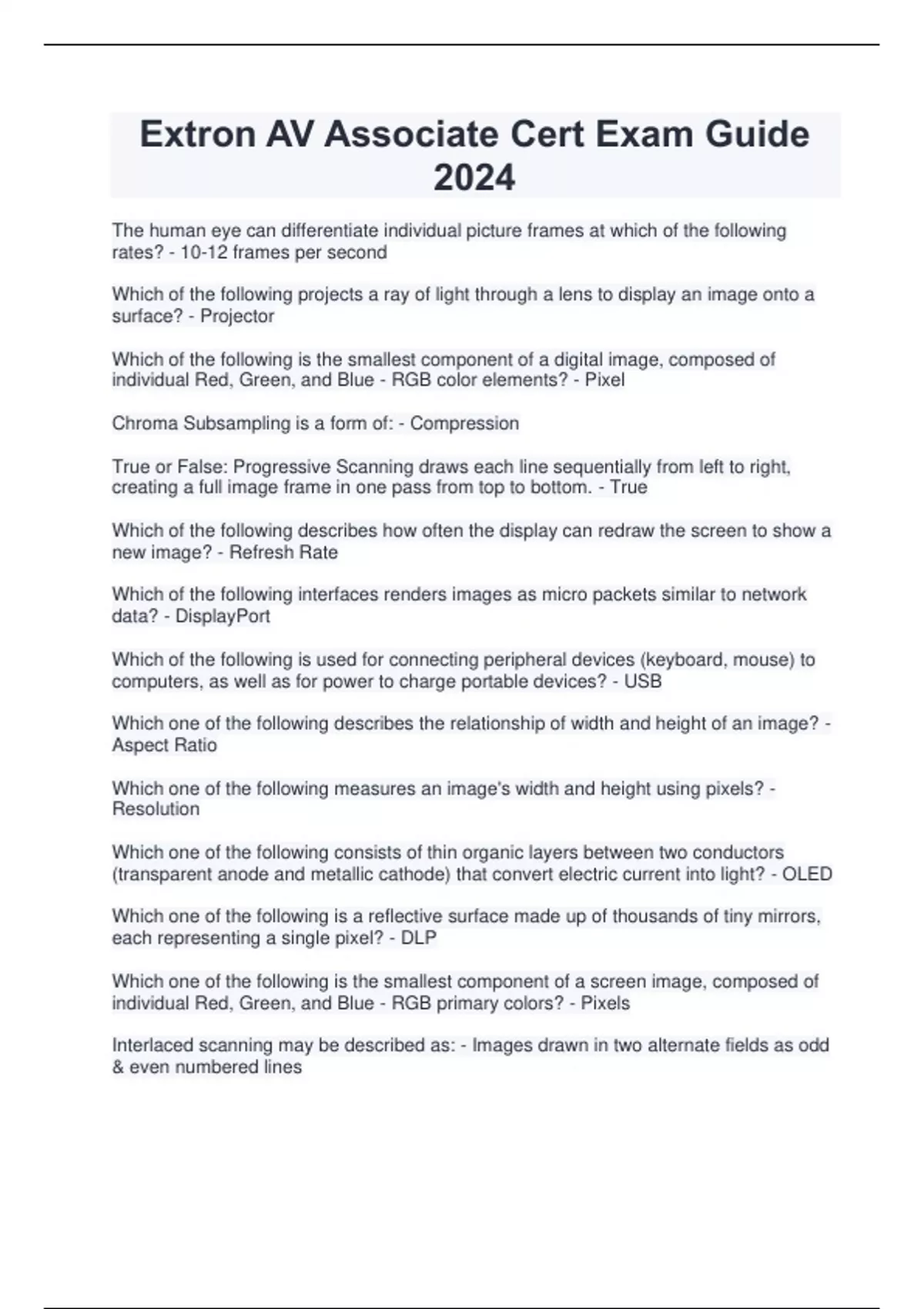 The human eye can differentiate individual picture frames at which of the following rates? - 10-12 frames per second Which of the following projects a ray of light through a lens to display an image onto a surface? - Projector Which of the following is the smallest component of a digital image, composed of individual Red, Green, and Blue - RGB color elements? - Pixel Chroma Subsampling is a form of: - Compression True or False: Progressive Scanning draws each line sequentially from left to right, creating a full image frame in one pass from top to bottom. - True Which of the following describes how often the display can redraw the screen to show a new image? - Refresh Rate Which of the following interfaces renders images as micro packets similar to network data? - DisplayPort Which of the following is used for connecting peripheral devices (keyboard, mouse) to computers, as well as for power to charge portable devices? - USB Which one of the following describes the relationship of width and height of an image? - Aspect Ratio Which one of the following measures an image's width and height using pixels? - Resolution Which one of the following consists of thin organic layers between two conductors (transparent anode and metallic cathode) that convert electric current into light? - OLED Which one of the following is a reflective surface made up of thousands of tiny mirrors, each representing a single pixel? - DLP Which one of the following is the smallest component of a screen image, composed of individual Red, Green, and Blue - RGB primary colors? - Pixels Interlaced scanning may be described as: - Images drawn in two alternate fields as odd & even numbered lines Which one of the following indicates the amount of data used per pixel to present color information? - Color Bit Depth Which one of the following is a digital transmission interface for uncompressed video, multi-channel audio, and control data that also supports High-bandwidth Digital Content Protection - HDCP? - HDMI (High Definition Multimedia Interface) Which one of the following digital broadcast standards is adopted in Europe, Asia, and Africa? - DVB (Digital Video Broadcasting) DVI and HDMI both use a signaling method known as: - TMDS (Transmission-Minimized Differential Signaling) Which of the following defines the science or study of sound, how it's created, its ability to travel within a space, and the way it's managed? - Acoustics Which of the following represents a logarithmic ratio to measure the change in sound intensity or electric signals? - Decibel (dB) Which of the following has a ground wire, and carries analog signals as one hot wire and one cold wire in reverse polarity to cancel noise and interference? - Balanced cables Which of the following connector is commonly used for twisted pair cabling that carries digital audio over the network? - RJ-45 Which of the following performs as a transducer, converting one form of energy to another, and is classified based on how it captures sound? - Microphone Which of the following is referred to as the safety zone that allows audio peaks to exceed the nominal level without clipping? - Headroom Which of the following is an example of dropping the sound levels for background music, to focus the audio on an important voice-over announcement? - Ducking Which of the following is the last link of the audio signal path? - Loudspeaker Which of the following is the average rate of speed at which sound travels through air, measured at sea level and 70F/20C degrees? - 1128 feet/second (343 meters/second) The rate at which the sound vibrations repeat is called: - Frequency Which of the following is related to the amount of energy that a sound wave carries? - Amplitude