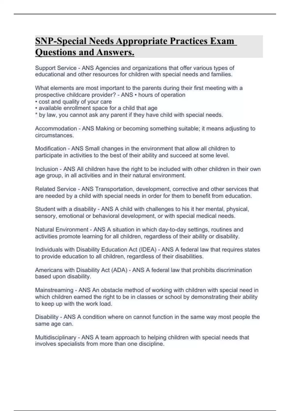 SNP-Special Needs Appropriate Practices Exam Questions and AnswersSNP-Special Needs Appropriate Practices Exam Questions and Answers