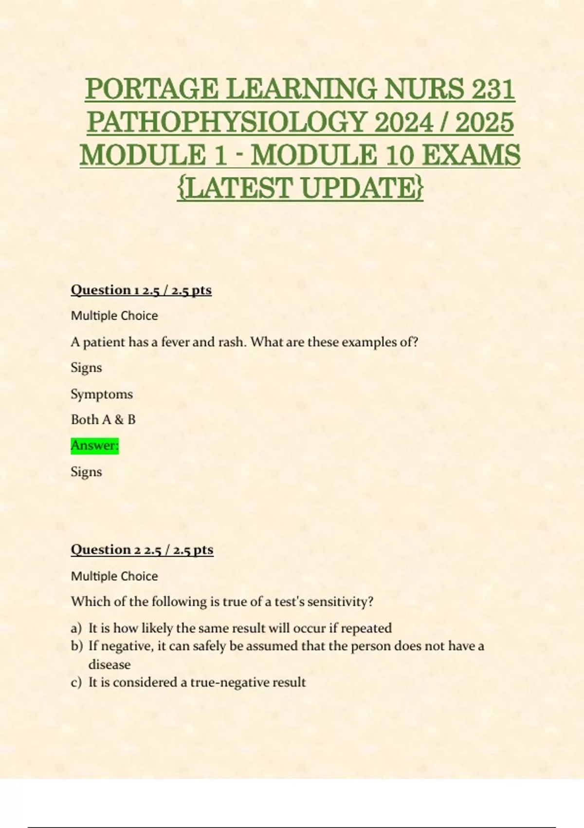 PORTAGE LEARNING NURS 231 PATHOPHYSIOLOGY 2024 / 2025 MODULE 1 - MODULE 10 EXAMS {LATEST UPDATE}