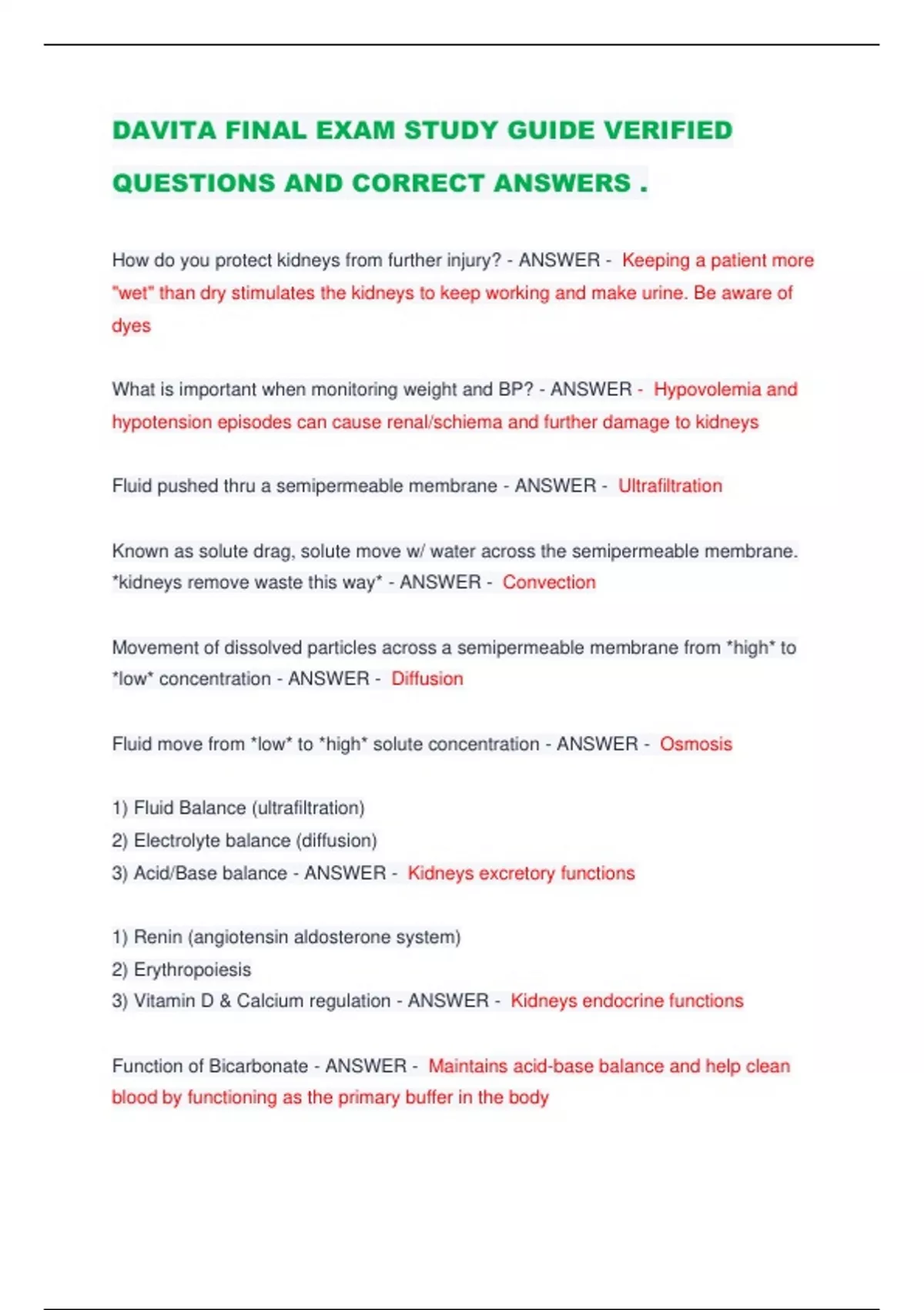 DAVITA FINAL EXAM STUDY GUIDE VERIFIED QUESTIONS AND CORRECT ANSWERS . How do you protect kidneys from further injury? - ANSWER - Keeping a patient more "wet" than dry stimulates the kidneys to keep working and make urine. Be aware of dyes What is important when monitoring weight and BP? - ANSWER - Hypovolemia and hypotension episodes can cause renal/schiema and further damage to kidneys Fluid pushed thru a semipermeable membrane - ANSWER - Ultrafiltration Known as solute drag, solute move w/ water across the semipermeable membrane. *kidneys remove waste this way* - ANSWER - Convection Movement of dissolved particles across a semipermeable membrane from *high* to *low* concentration - ANSWER - Diffusion Fluid move from *low* to *high* solute concentration - ANSWER - Osmosis 1) Fluid Balance (ultrafiltration) 2) Electrolyte balance (diffusion) 3) Acid/Base balance - ANSWER - Kidneys excretory functions