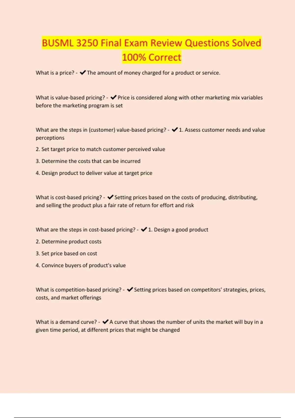 BUSML 3250 Final Exam Review Questions Solved 100% Correct What is a price? - The amount of money charged for a product or service. What is value-based pricing? - Price is considered along with other marketing mix variables before the marketing program is set What are the steps in (customer) value-based pricing? - 1. Assess customer needs and value perceptions 2. Set target price to match customer perceived value 3. Determine the costs that can be incurred 4. Design product to deliver value at target price What is cost-based pricing? - Setting prices based on the costs of producing, distributing, and selling the product plus a fair rate of return for effort and risk