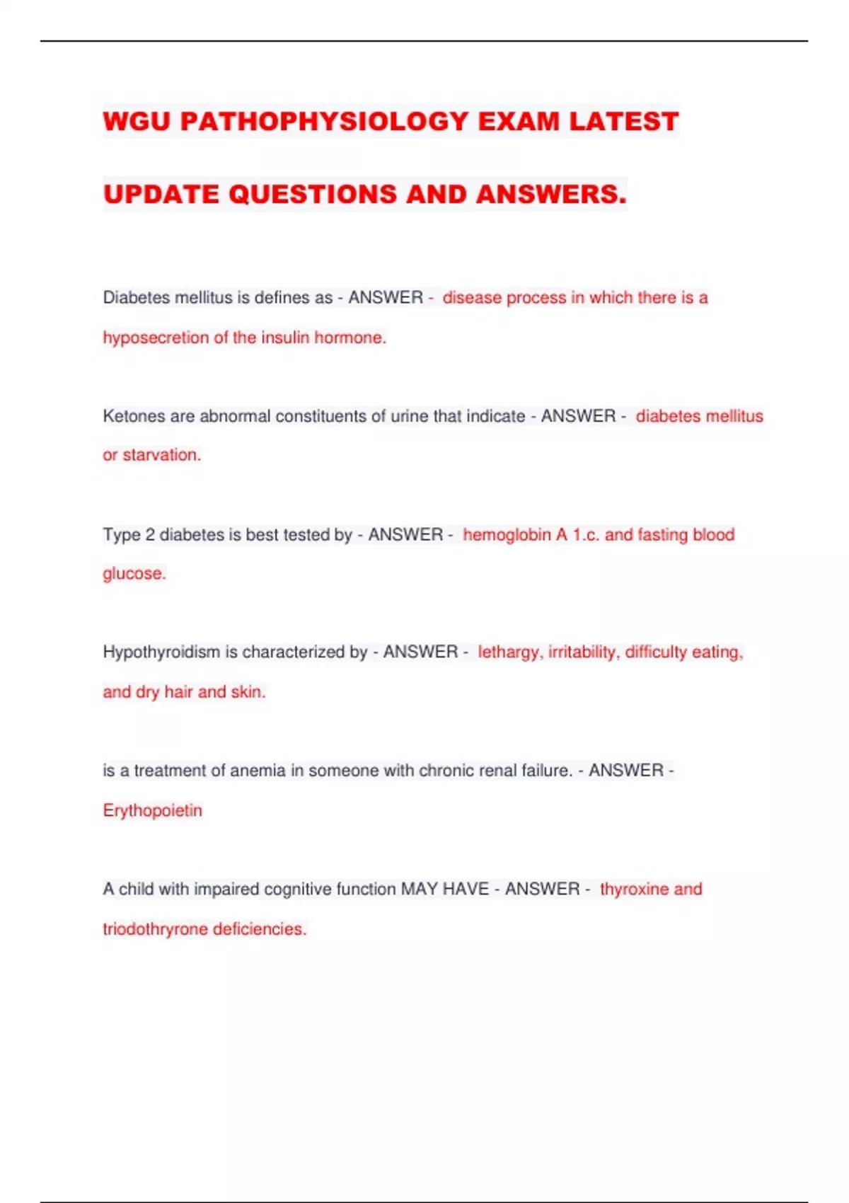WGU PATHOPHYSIOLOGY EXAM LATEST UPDATE QUESTIONS AND ANSWERS. Diabetes mellitus is defines as - ANSWER - disease process in which there is a hyposecretion of the insulin hormone. Ketones are abnormal constituents of urine that indicate - ANSWER - diabetes mellitus or starvation. Type 2 diabetes is best tested by - ANSWER - hemoglobin A 1.c. and fasting blood glucose. Hypothyroidism is characterized by - ANSWER - lethargy, irritability, difficulty eating, and dry hair and skin. is a treatment of anemia in someone with chronic renal failure. - ANSWER - Erythopoietin