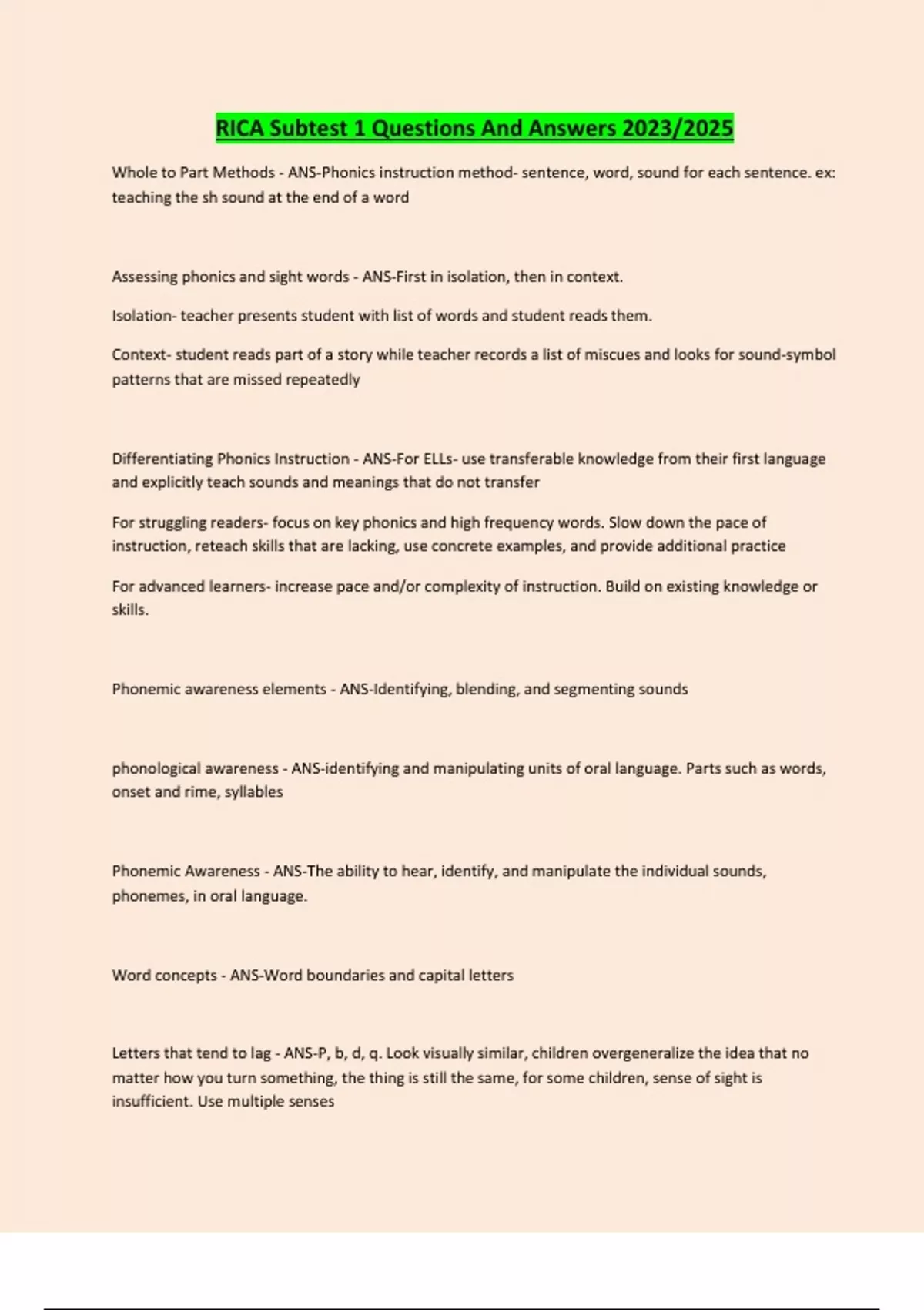 RICA Subtest 1 Questions And Answers 2023/2025 Whole to Part Methods - ANS-Phonics instruction method- sentence, word, sound for each sentence. ex: teaching the sh sound at the end of a word Assessing phonics and sight words - ANS-First in isolation, then in context. Isolation- teacher presents student with list of words and student reads them. Context- student reads part of a story while teacher records a list of miscues and looks for sound-symbol patterns that are missed repeatedly Differentiating Phonics Instruction - ANS-For ELLs- use transferable knowledge from their first language and explicitly teach sounds and meanings that do not transfer For struggling readers- focus on key phonics and high frequency words. Slow down the pace of instruction, reteach skills that are lacking, use concrete examples, and provide additional practice For advanced learners- increase pace and/or complexity of instruction. Build on existing knowledge or skills. Phonemic awareness elements - ANS-Identifying, blending, and segmenting sounds phonological awareness - ANS-identifying and manipulating units of oral language. Parts such as words, onset and rime, syllables Phonemic Awareness - ANS-The ability to hear, identify, and manipulate the individual sounds, phonemes, in oral language. Word concepts - ANS-Word boundaries and capital letters Letters that tend to lag - ANS-P, b, d, q. Look visually similar, children overgeneralize the idea that no matter how you turn something, the thing is still the same, for some children, sense of sight is insufficient. Use multiple senses Language Experience Approach (LEA) - ANS-Uses students' words to create a text that becomes material for a reading lesson. Ex- student draws a photo and tells you what they drew, you write the sentence. Teachers have children follow along with fingers as they read aloud. Teaches directionality and tracking of print. Creates text that is of interest to students and based on their personal experiences. Environmental print - ANS-signs, labels, and other print found in the community Trace and say method - ANS-Is kinesthetic, metacognitive, multisensory. Ex - trace P while saying, "down, up, and around" Elkonin Boxes - ANS-a strategy for segmenting sounds in a word that involves drawing a box to represent each sound in a word. When should students be fluent readers? - ANS-Exit criteria for third grade 1st grade fluency and deciding - ANS-Letters sound correspondence and onset rime Second grade fluency and decoding - ANS-Phonics generalizations Alphabetic principle - ANS-the understanding that there are systematic and predictable relationships between written letters and spoken sounds Phonics generalizations - ANS-phonics rules that are taught to emerging readers to help them learn letter combination sounds to increase reading and spelling ability. Ex- silent e rule, doubling consonants hop -> hopping open syllable - ANS- Continues...