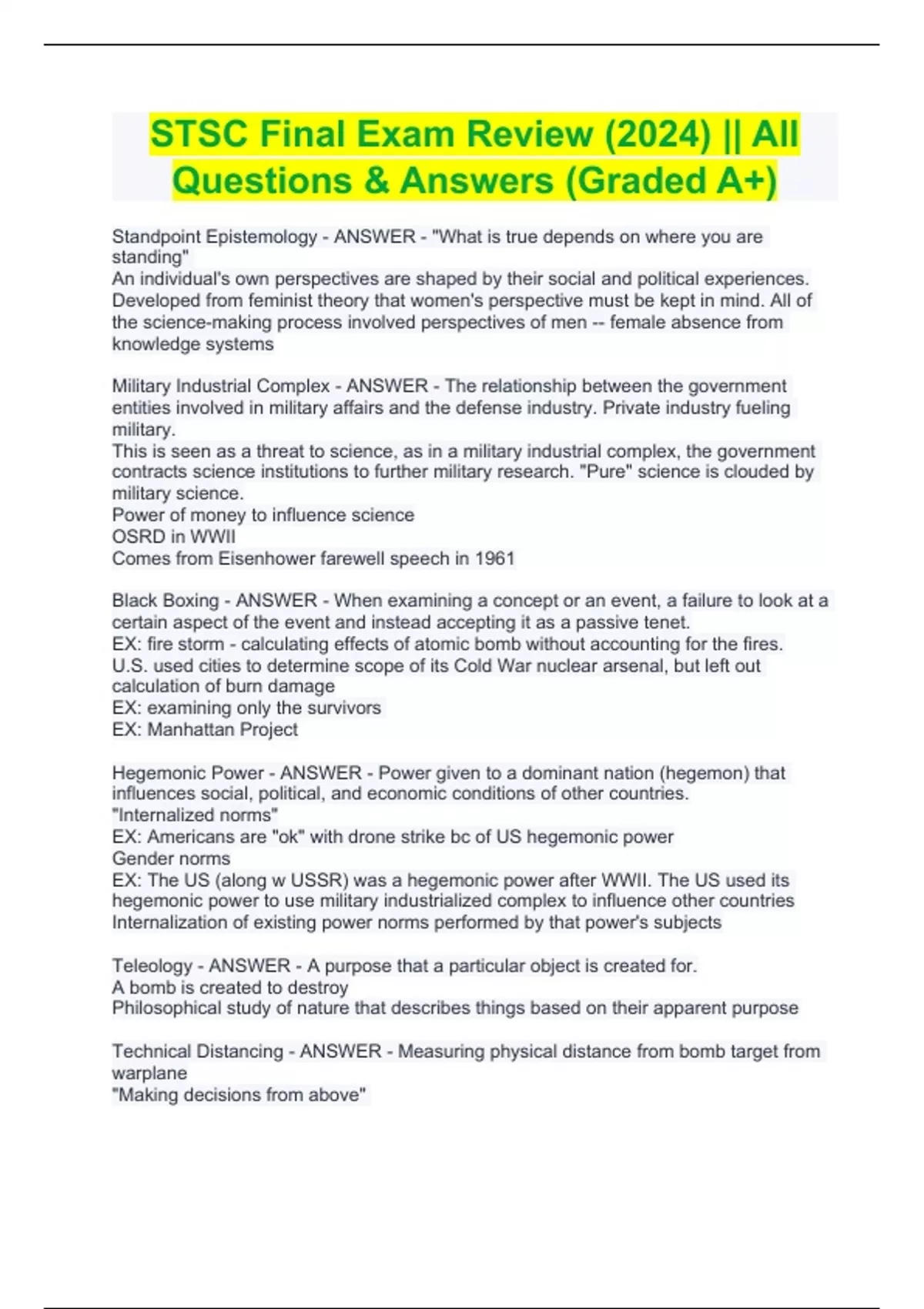 STSC Final Exam Review (2024) || All Questions & Answers (Graded A+) STSC Final Exam Review (2024) || All Questions & Answers (Graded A+) Standpoint Epistemology - ANSWER - "What is true depends on where you are standing" An individual's own perspectives are shaped by their social and political experiences. Developed from feminist theory that women's perspective must be kept in mind. All of the science-making process involved perspectives of men -- female absence from knowledge systems Military Industrial Complex - ANSWER - The relationship between the government entities involved in military affairs and the defense industry. Private industry fueling military. This is seen as a threat to science, as in a military industrial complex, the government contracts science institutions to further military research. "Pure" science is clouded by military science. Power of money to influence science OSRD in WWII Comes from Eisenhower farewell speech in 1961 Black Boxing - ANSWER - When examining a concept or an event, a failure to look at a certain aspect of the event and instead accepting it as a passive tenet. EX: fire storm - calculating effects of atomic bomb without accounting for the fires. U.S. used cities to determine scope of its Cold War nuclear arsenal, but left out calculation of burn damage EX: examining only the survivors EX: Manhattan Project Hegemonic Power - ANSWER - Power given to a dominant nation (hegemon) that influences social, political, and economic conditions of other countries. "Internalized norms" EX: Americans are "ok" with drone strike bc of US hegemonic power Gender norms EX: The US (along w USSR) was a hegemonic power after WWII. The US used its hegemonic power to use military industrialized complex to influence other countries Internalization of existing power norms performed by that power's subjects Teleology - ANSWER - A purpose that a particular object is created for. A bomb is created to destroy Philosophical study of nature that describes things based on their apparent purpose Technical Distancing - ANSWER - Measuring physical distance from bomb target from warplane "Making decisions from above" Industrialized logic of strategic airfare (WWII) Distance network of culpability from effect on victims For example, line of thought like "I didn't make the bomb or choose to use it - I just flew the plane that dropped it" Drones Fascism