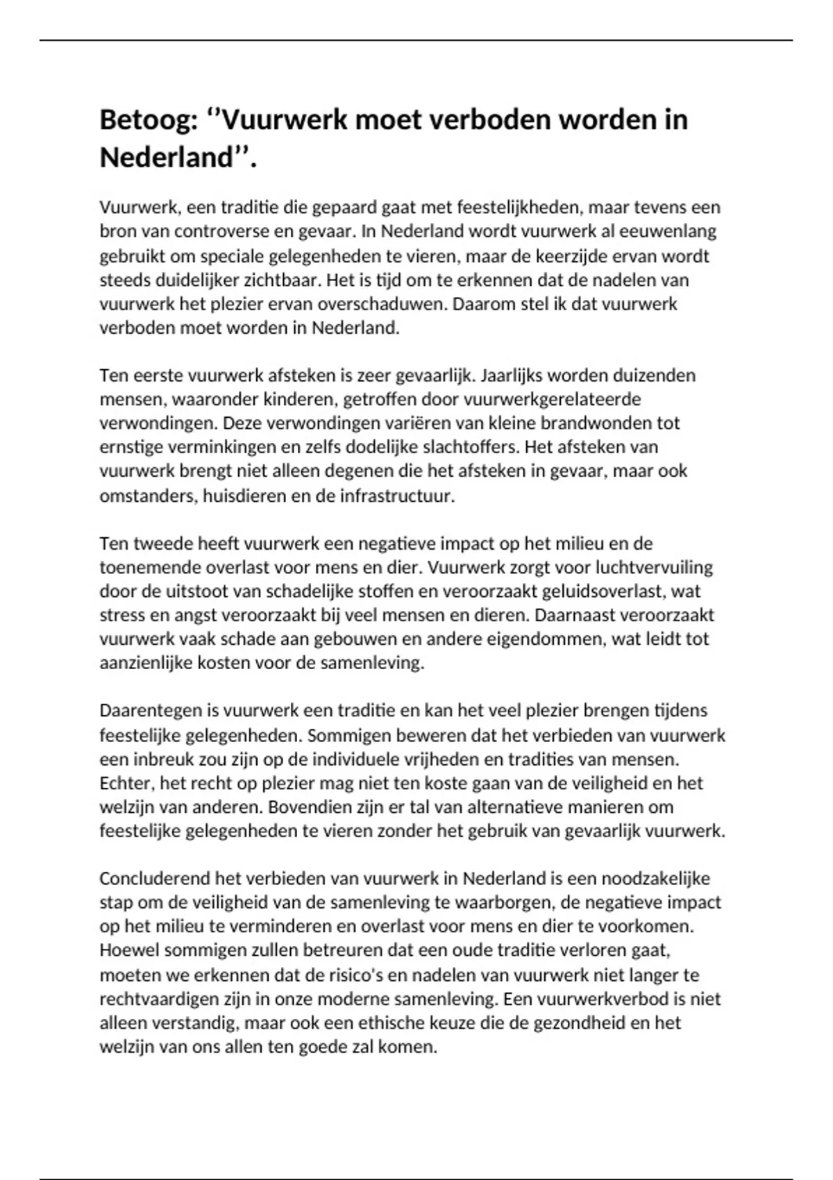 Samenvatting Betoog:'' Vuurwerk moet verboden worden in Nederland''.