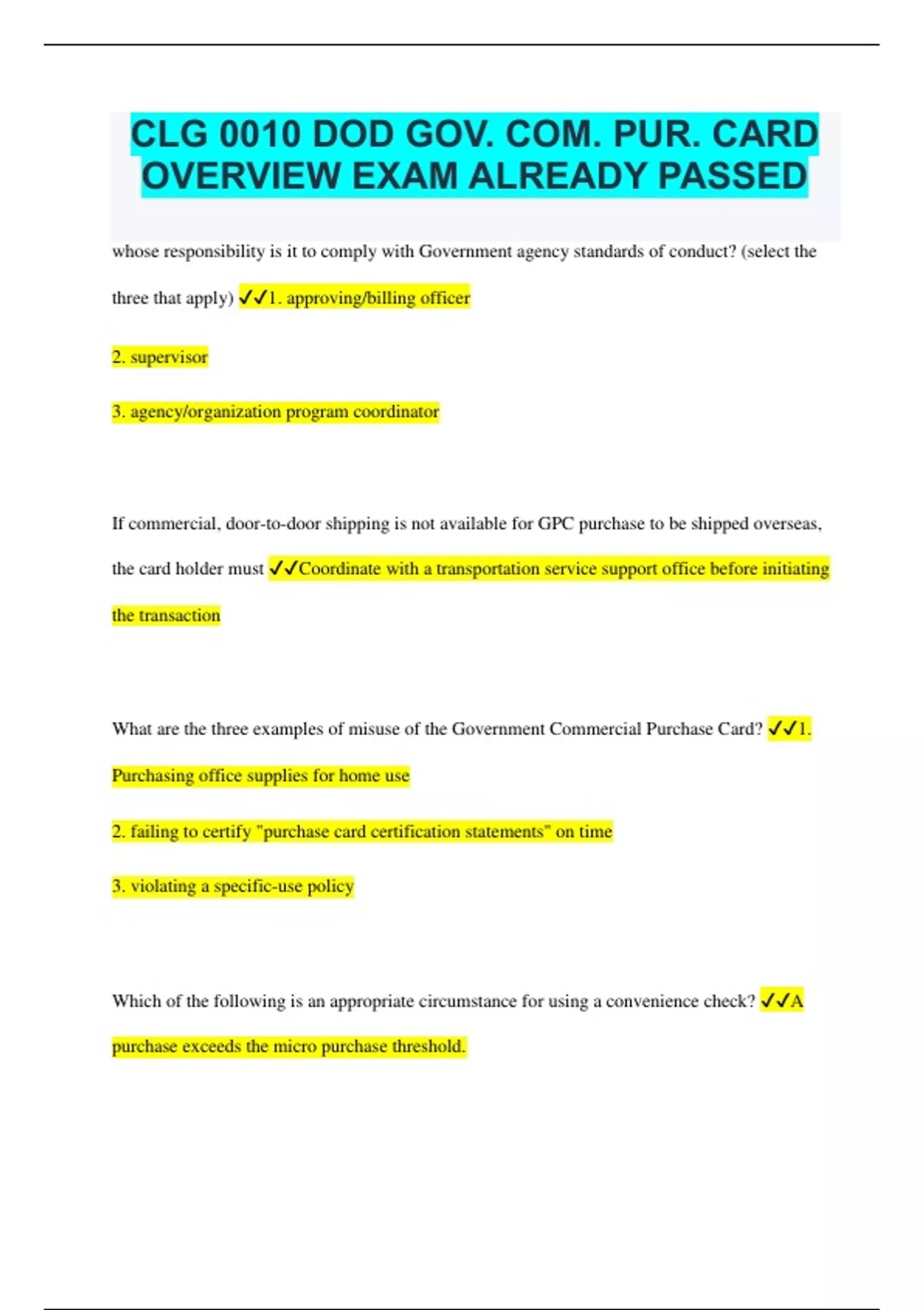 CLG 0010 DOD GOV. COM. PUR. CARD OVERVIEW EXAM ALREADY PASSED