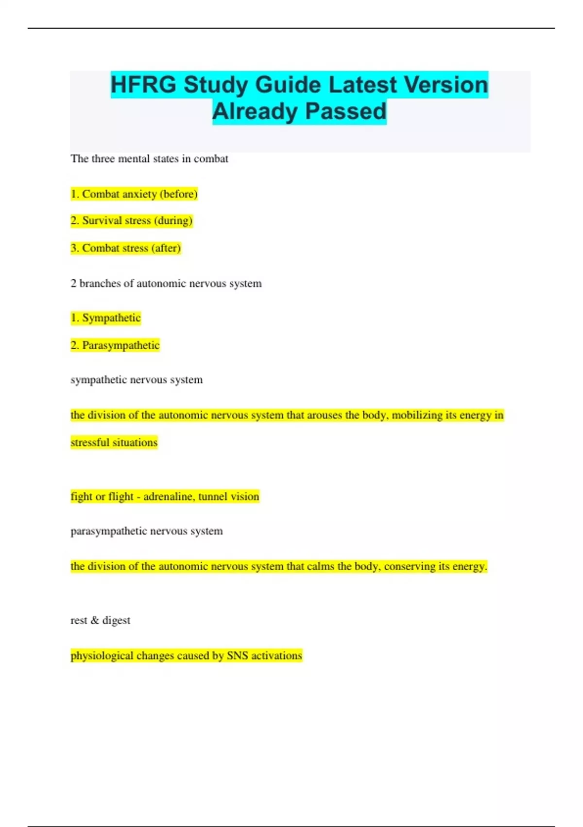 HFRG Study Guide Latest Version Already Passed The three mental states in combat 1. Combat anxiety (before) 2. Survival stress (during) 3. Combat stress (after) 2 branches of autonomic nervous system 1. Sympathetic 2. Parasympathetic sympathetic nervous system the division of the autonomic nervous system that arouses the body, mobilizing its energy in stressful situations fight or flight - adrenaline, tunnel vision parasympathetic nervous system the division of the autonomic nervous system that calms the body, conserving its energy. rest & digest physiological changes caused by SNS activations Negative stress: -fight or flight - blood pressure increases, heart beats faster and with more force, pupils dilate, digestive system slows down. Positive Stress: - when a person is motivated, excited, to a point that enables them to respond constructively and enables high-level performance -hormones involved with positive are serotonin, adrenalin, and nor epinephrine Four specific triggers that activate the SNS 1. objective threat perception 2. objective fear perception 3. physical exhaustion 4. startle response perceptual narrowing The tendency for the perceptual field to "shrink"; sometimes called tunnel vision, or "weapon focus" in police work effects of SNS on vision and stance under stress, SNS will adjust the body to receive as much information as possible to survive the threat. - dilating pupils, pulling head square to become binocular, body naturally going to fight stance basically pressure point under nose infra orbital pressure point under ear mandibular angle pressure point under jaw hypoglossal pressure point at base of neck in front center jugular notch pressure point at base of neck/shoulder clavicle notch nerve on top of forearm radial nerve nerve underneath forearm median nerve nerve motor point on side/above knee common peroneal motor point above quad-ish area femoral nerve near back of calve tibial nerve mp the peroneal nerve motor point above foot superficial peroneal 3 Components of Acceptability Tactical Legal Medical MCOLEs subject action, in order,