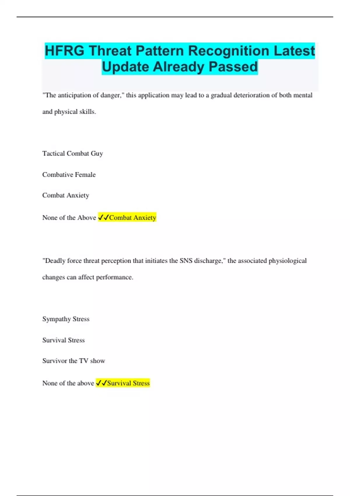 HFRG Threat Pattern Recognition Latest Update Already Passed "The anticipation of danger," this application may lead to a gradual deterioration of both mental and physical skills. Tactical Combat Guy Combative Female Combat Anxiety None of the Above Combat Anxiety "Deadly force threat perception that initiates the SNS discharge," the associated physiological changes can affect performance. Sympathy Stress Survival Stress Survivor the TV show None of the above Survival Stress The post event mental and physiological symptoms that are a result of the SNS activation and the sudden return to the Parasympathetic Nervous System (PNS) "backlash," which may distort the memory. Combat Stress Mental Brake Down Superficial Stress None of the Above Combat Stress A part of the peripheral nervous system and it controls many organs and muscles within the body. We are often unaware of the workings of this type of system and it controls many organs and muscles within the body. (ABC) Automated Brachial Cervix (ANS) Autonomic Nervous System (TMI) To Much Information (UTI) Unbalanced Temperament Injury (ANS) Autonomic Nervous System The Autonomic Nervous system is divided into what two parts? Digestive and Reactionary. Cranial Nervous System/ Sympathy System. Parasympathetic Nervous System, Sympathetic Nervous system. None of the Above Parasympathetic Nervous System, Sympathetic Nervous system. What is used to demonstrate the relationship between stress and performance associated with the activation of the sympathetic nervous system? Perverted V Law Introverted-U Law Pretext Relapse Law None of the Above Introverted-U Law Which system within the Autonomic Nervous system is responsible for the "flight or flee?" Paralyzed System Parasympathetic Nervous System Sympathetic Nervous System None of the Above Sympathetic Nervous System When activated what system will make the heart beat slower and with less force, the pupils will constrict, mucus production increases and digestion can start? Paralyzed System