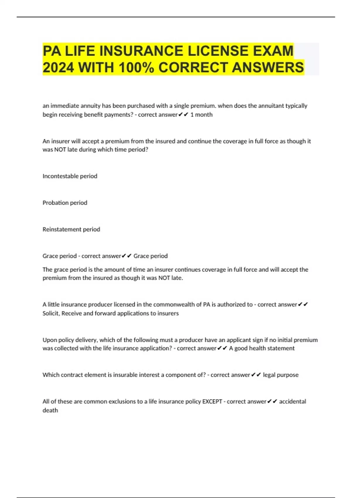 PA LIFE INSURANCE LICENSE EXAM 2024 WITH 100% CORRECT ANSWERS an immediate annuity has been purchased with a single premium. when does the annuitant typically begin receiving benefit payments? - correct answer 1 month An insurer will accept a premium from the insured and continue the coverage in full force as though it was NOT late during which time period? Incontestable period Probation period Reinstatement period Grace period - correct answer Grace period The grace period is the amount of time an insurer continues coverage in full force and will accept the premium from the insured as though it was NOT late. A little insurance producer licensed in the commonwealth of PA is authorized to - correct answer Solicit, Receive and forward applications to insurers Upon policy delivery, which of the following must a producer have an applicant sign if no initial premium was collected with the life insurance application? - correct answer A good health statement Which contract element is insurable interest a component of? - correct answer legal purpose All of these are common exclusions to a life insurance policy EXCEPT - correct answer accidental death