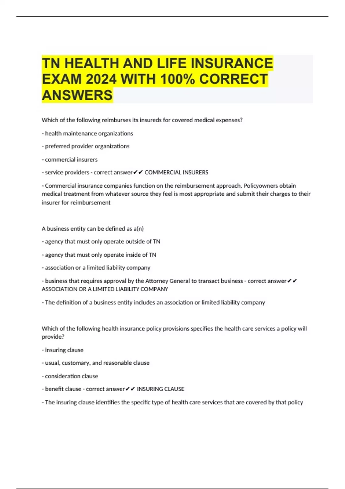 TN HEALTH AND LIFE INSURANCE EXAM 2024 WITH 100% CORRECT ANSWERS Which of the following reimburses its insureds for covered medical expenses? - health maintenance organizations - preferred provider organizations - commercial insurers - service providers - correct answer COMMERCIAL INSURERS - Commercial insurance companies function on the reimbursement approach. Policyowners obtain medical treatment from whatever source they feel is most appropriate and submit their charges to their insurer for reimbursement A business entity can be defined as a(n) - agency that must only operate outside of TN - agency that must only operate inside of TN - association or a limited liability company - business that requires approval by the Attorney General to transact business - correct answer ASSOCIATION OR A LIMITED LIABILITY COMPANY - The definition of a business entity includes an association or limited liability company Which of the following health insurance policy provisions specifies the health care services a policy will provide? - insuring clause - usual, customary, and reasonable clause - consideration clause - benefit clause