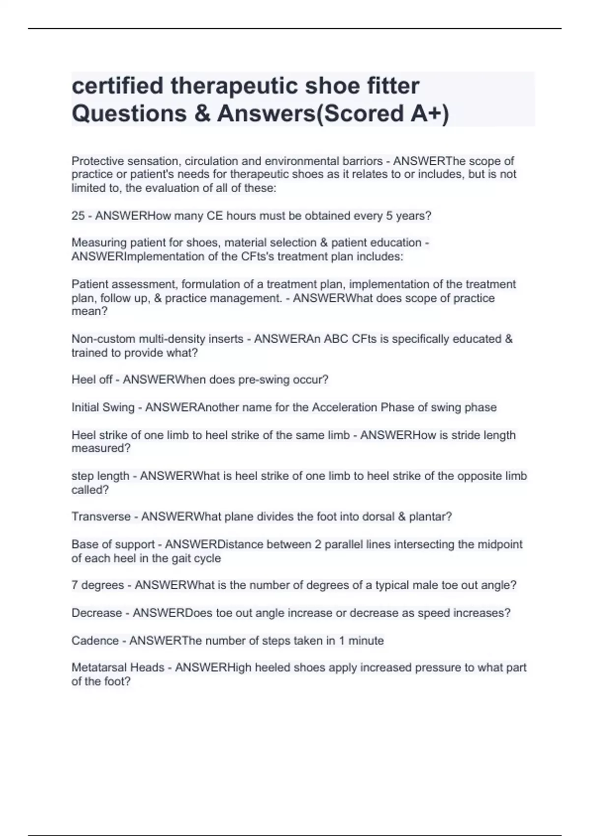 certified therapeutic shoe fitter Questions & Answers(Scored A+) Protective sensation, circulation and environmental barriors - ANSWERThe scope of practice or patient's needs for therapeutic shoes as it relates to or includes, but is not limited to, the evaluation of all of these: 25 - ANSWERHow many CE hours must be obtained every 5 years? Measuring patient for shoes, material selection & patient education - ANSWERImplementation of the CFts's treatment plan includes: Patient assessment, formulation of a treatment plan, implementation of the treatment plan, follow up, & practice management. - ANSWERWhat does scope of practice mean? Non-custom multi-density inserts - ANSWERAn ABC CFts is specifically educated & trained to provide what? Heel off - ANSWERWhen does pre-swing occur? Initial Swing - ANSWERAnother name for the Acceleration Phase of swing phase Heel strike of one limb to heel strike of the same limb - ANSWERHow is stride length measured? step length - ANSWERWhat is heel strike of one limb to heel strike of the opposite limb called? Transverse - ANSWERWhat plane divides the foot into dorsal & plantar? Base of support - ANSWERDistance between 2 parallel lines intersecting the midpoint of each heel in the gait cycle 7 degrees - ANSWERWhat is the number of degrees of a typical male toe out angle? D