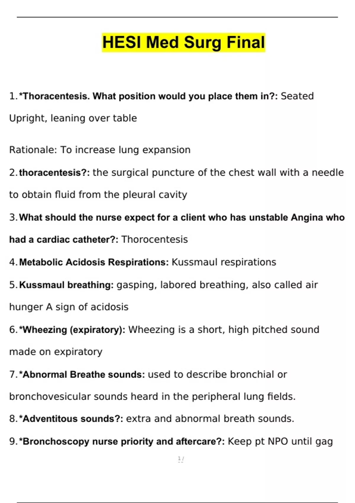 1. *Thoracentesis. What position would you place them in?: Seated Upright, leaning over table Rationale: To increase lung expansion 2. thoracentesis?: the surgical puncture of the chest wall with a needle to obtain fluid from the pleural cavity 3. What should the nurse expect for a client who has unstable Angina who had a cardiac catheter?: Thorocentesis 4. Metabolic Acidosis Respirations: Kussmaul respirations 5. Kussmaul breathing: gasping, labored breathing, also called air hunger A sign of acidosis 6. *Wheezing (expiratory): Wheezing is a short, high pitched sound made on expiratory 7. *Abnormal Breathe sounds: used to describe bronchial or bronchovesicular sounds heard in the peripheral lung fields. 8. *Adventitous sounds?: extra and abnormal breath sounds. 9. *Bronchoscopy nurse priority and aftercare?: Keep pt NPO until gag reflux returns. 10. bronchoscopy?: A visual examination of the bronchi 11. Bronchoscopy procedure: Bronchoscopy is a procedure that allows your doc- tor to look at your airway through a thin viewing instrument called a bronchoscope. During a bronchoscopy , your doctor will examine your throat, larynx , trachea , and lower airways. Can get a specifimen collection, do biopsy, suction mucous plugs and remove foreign objects