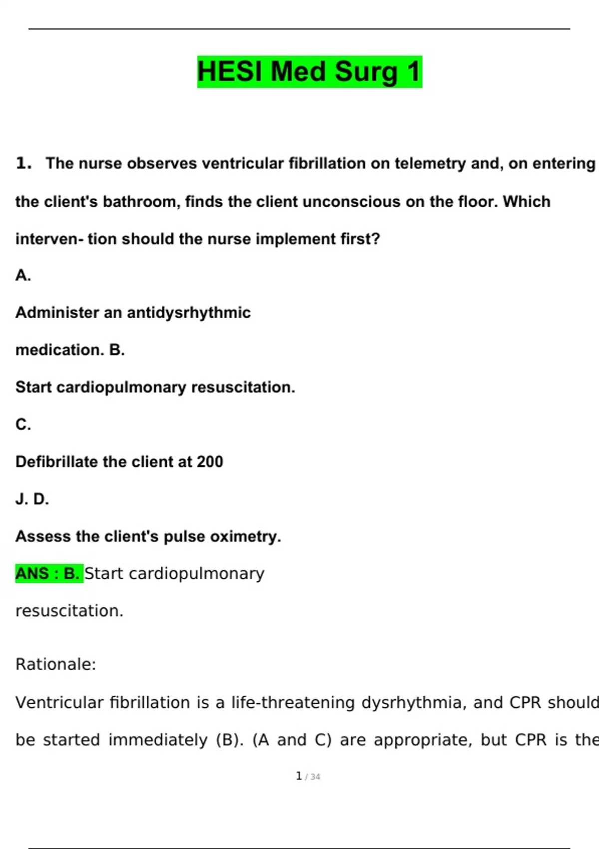 1. The nurse observes ventricular fibrillation on telemetry and, on entering the client's bathroom, finds the client unconscious on the floor. Which interven- tion should the nurse implement first? A. Administer an antidysrhythmic medication. B. Start cardiopulmonary resuscitation. C. Defibrillate the client at 200 J. D. Assess the client's pulse oximetry. ANS : B. Start cardiopulmonary resuscitation. Rationale: Ventricular fibrillation is a life-threatening dysrhythmia, and CPR should be started immediately (B). (A and C) are appropriate, but CPR is the priority action. The client is dying, and (D) does not address the seriousness of this situation. 2. The nurse assesses a client who has been prescribed furosemide (Lasix) for cardiac disease. Which electrocardiographic change would be a concern for a client taking a diuretic? A. Tall, spiked T waves B. A prolonged QT interval C. A widening QRS complex D. Presence of a U wave ANS : D. Presence of a U wave Rationale: A U wave (D) is a positive deflection following the T wave and is often present with hypokalemia (low potassium level). (A, B, and C) are all signs of hyperkalemia.