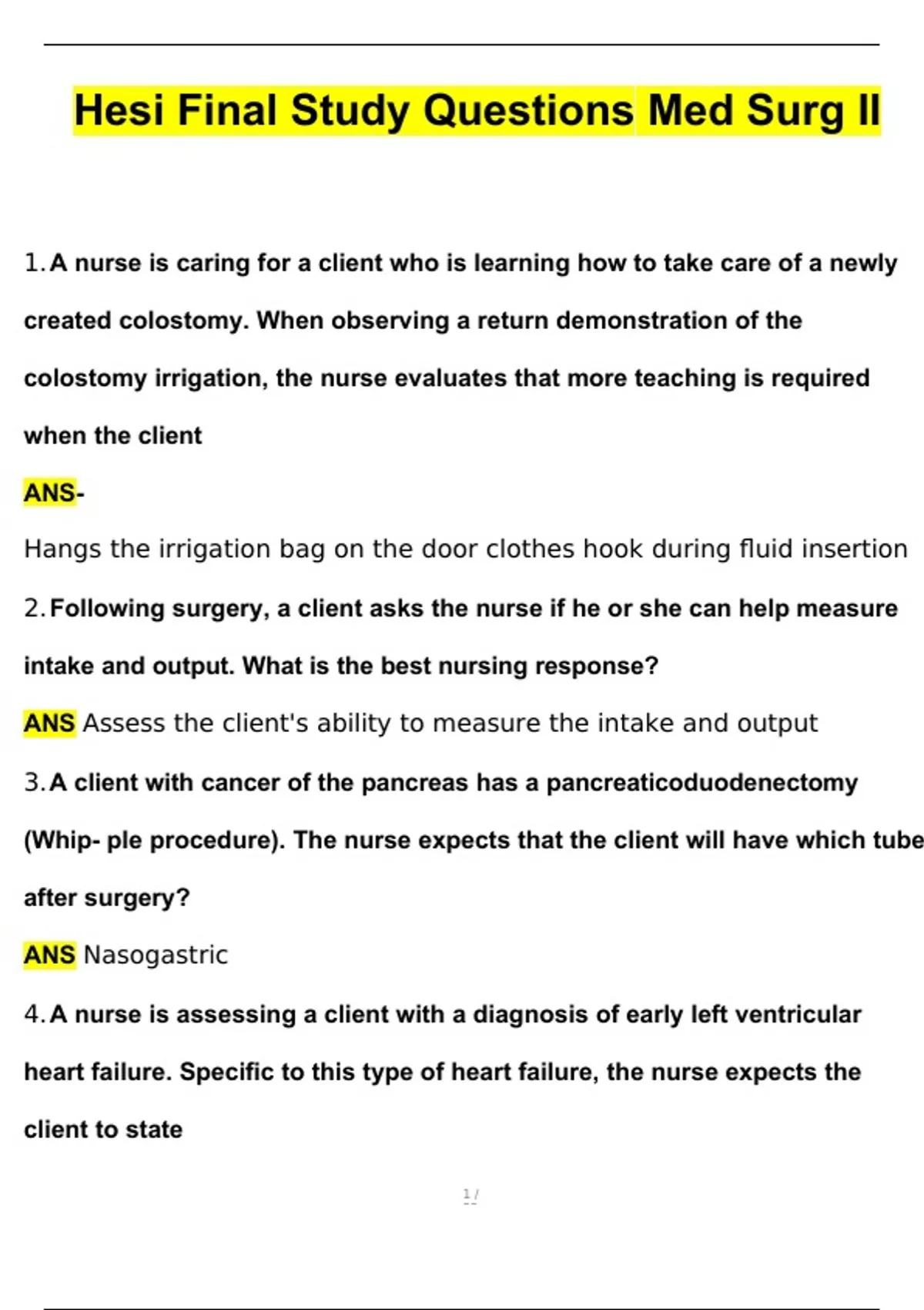 1. A nurse is caring for a client who is learning how to take care of a newly created colostomy. When observing a return demonstration of the colostomy irrigation, the nurse evaluates that more teaching is required when the client ANS Hangs the irrigation bag on the door clothes hook during fluid insertion 2. Following surgery, a client asks the nurse if he or she can help measure intake and output. What is the best nursing response? ANS Assess the client's ability to measure the intake and output 3. A client with cancer of the pancreas has a pancreaticoduodenectomy (Whip- ple procedure). The nurse expects that the client will have which tube after surgery? ANS Nasogastric 4. A nurse is assessing a client with a diagnosis of early left ventricular heart failure. Specific to this type of heart failure, the nurse expects the client to state ANS "I have trouble breathing when I walk rapidly."