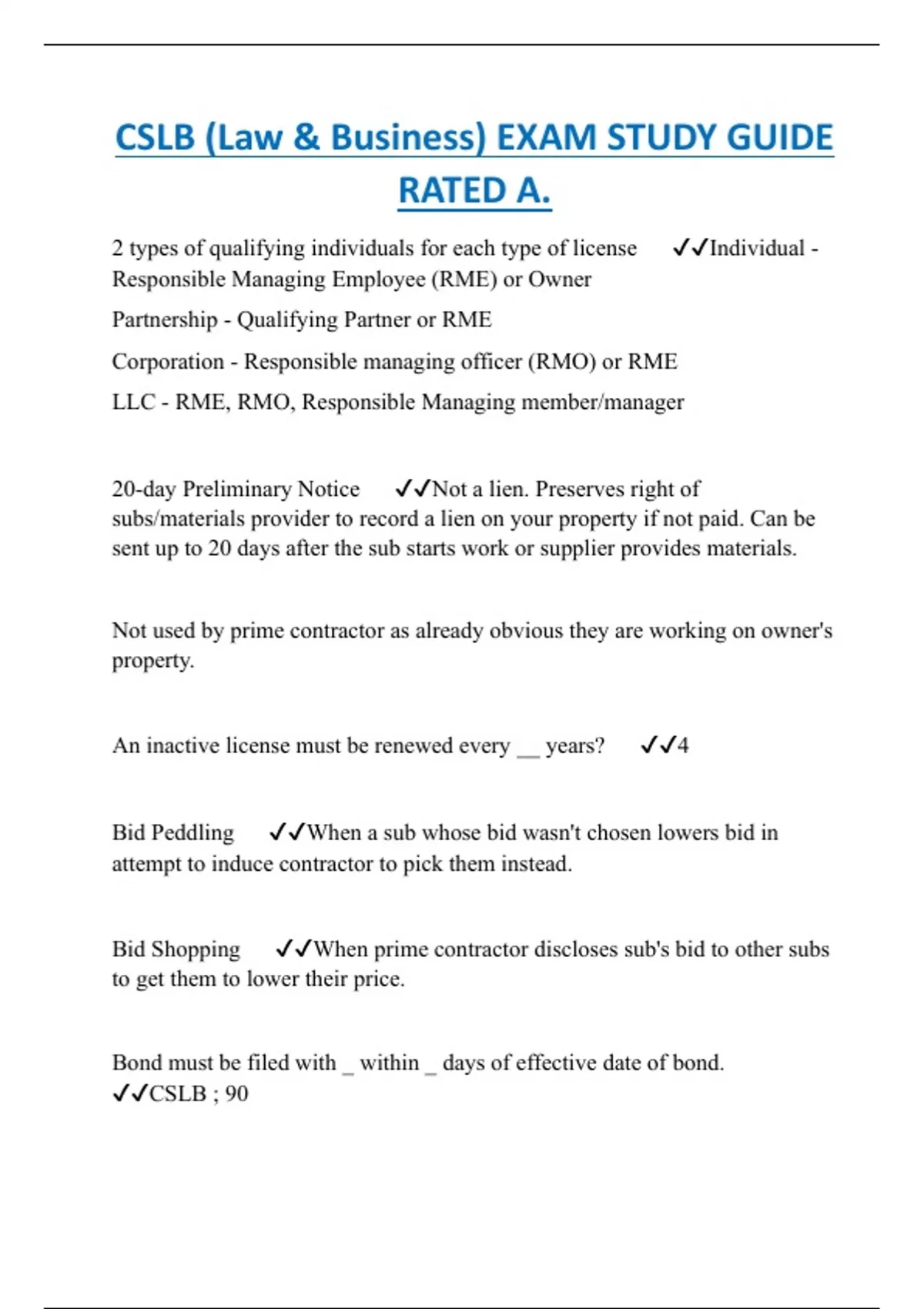 CSLB (Law & Business) EXAM STUDY GUIDE RATED A.