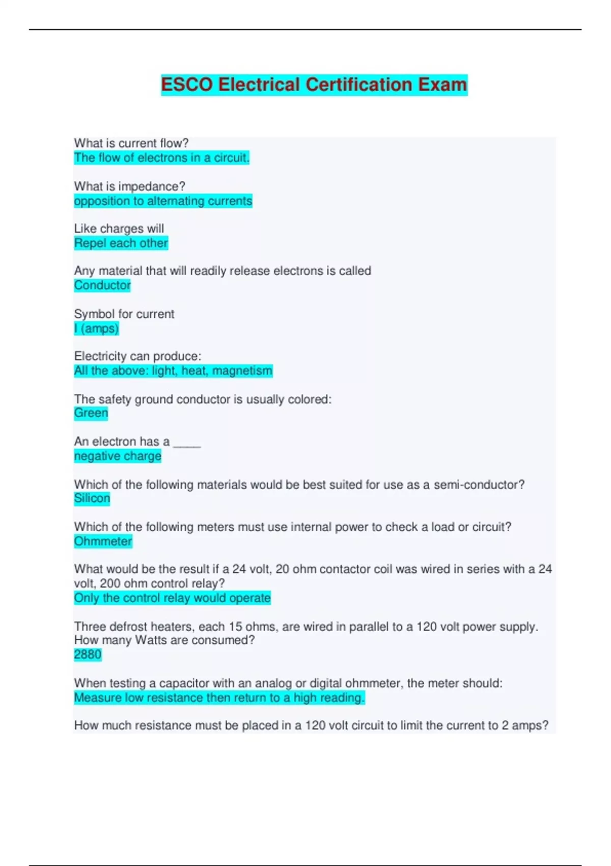 ESCO Electrical Certification Exam - Questions and Answers What is current flow? The flow of electrons in a circuit. What is impedance? opposition to alternating currents Like charges will Repel each other Any material that will readily release electrons is called Conductor Symbol for current I (amps) Electricity can produce: All the above: light, heat, magnetism The safety ground conductor is usually colored: Green An electron has a ____ negative charge Which of the following materials would be best suited for use as a semi-conductor? Silicon Which of the following meters must use internal power to check a load or circuit? Ohmmeter What would be the result if a 24 volt, 20 ohm contactor coil was wired in series with a 24 volt, 200 ohm control relay? Only the control relay would operate Three defrost heaters, each 15 ohms, are wired in parallel to a 120 volt power supply. How many Watts are consumed? 2880 When testing a capacitor with an analog or digital ohmmeter, the meter should: Measure low resistance then return to a high reading. How much resistance must be placed in a 120 volt circuit to limit the current to 2 amps? 60 ohms What is resistance? opposition to electron flow In electrical wiring, a black colored wire indicates A hot conductor How many watts are used by a heater operating on 460 volts and drawing 5 amps? 2300 How are fuses sized? A: By amperage B: By microfarads C: By voltage D: Both a and c What is generally considered the maximum allowable supply voltage variation? 5% Capacitors are rated in ___. By both their microfarad capacity and their voltage limit What is the term used to describe the output side of a transformer? Secondary side One horsepower is equal to ______ watts. 746 watts A parallel circuit contains an 18 ohm and a 9 ohm resistor. What is the total resistance? 6 ohms. In a series circuit, the voltage drop across each load will: Add up to equal the source voltage Which of the following is equal to 2.1kW? 2100 watts A capacitor analyzer is designed to check: The capacitance of the capacitor. On an electronic oil safety switch, what changes the pressure signal to an electrical signal? Transducer