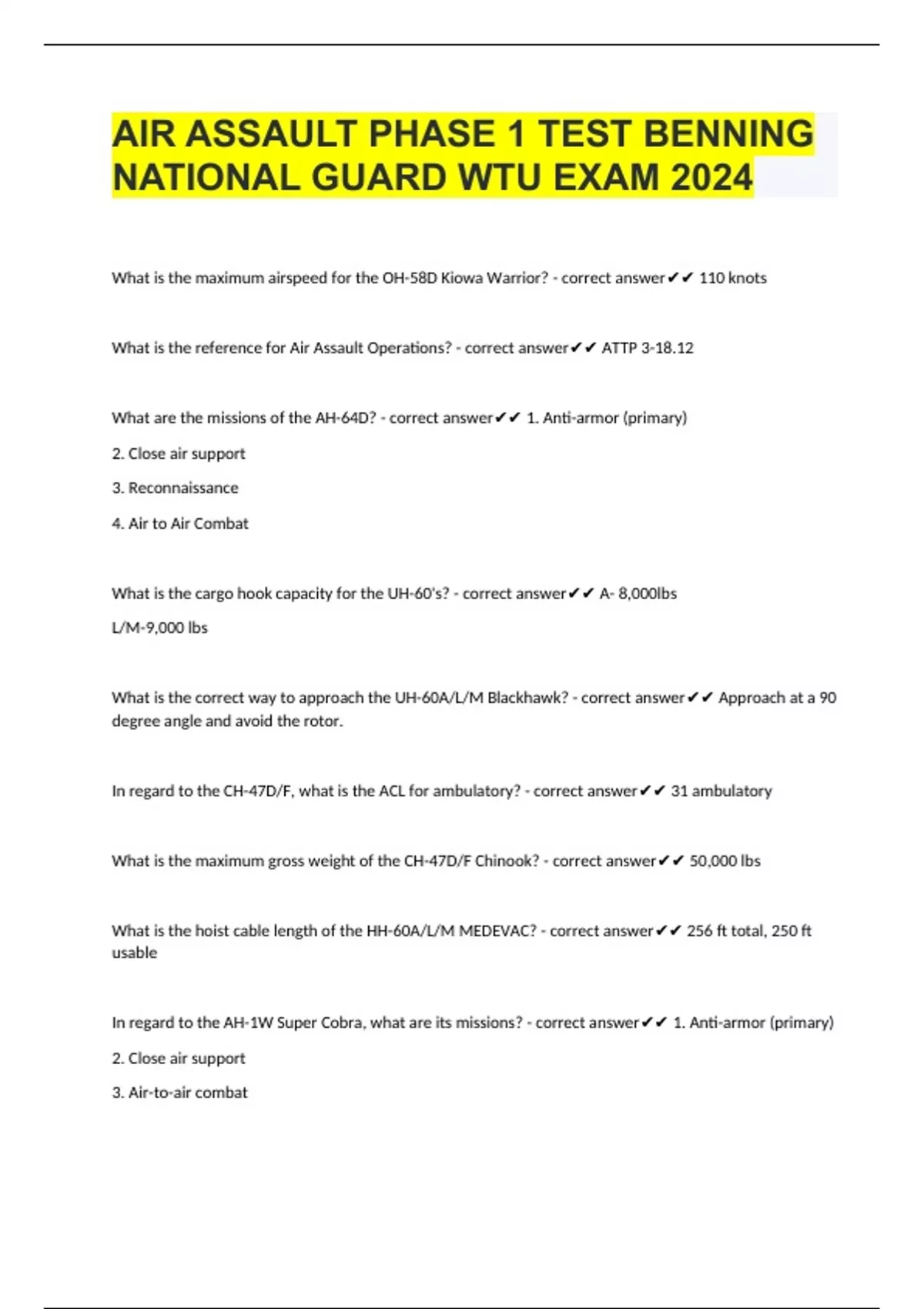 AIR ASSAULT PHASE 1 TEST BENNING NATIONAL GUARD WTU EXAM 2024 What is the maximum airspeed for the OH-58D Kiowa Warrior? - correct answer 110 knots What is the reference for Air Assault Operations? - correct answer ATTP 3-18.12 What are the missions of the AH-64D? - correct answer 1. Anti-armor (primary) 2. Close air support 3. Reconnaissance 4. Air to Air Combat What is the cargo hook capacity for the UH-60's? - correct answer A- 8,000lbs L/M-9,000 lbs What is the correct way to approach the UH-60A/L/M Blackhawk? - correct answer Approach at a 90 degree angle and avoid the rotor. In regard to the CH-47D/F, what is the ACL for ambulatory? - correct answer 31 ambulatory What is the maximum gross weight of the CH-47D/F Chinook? - correct answer 50,000 lbs