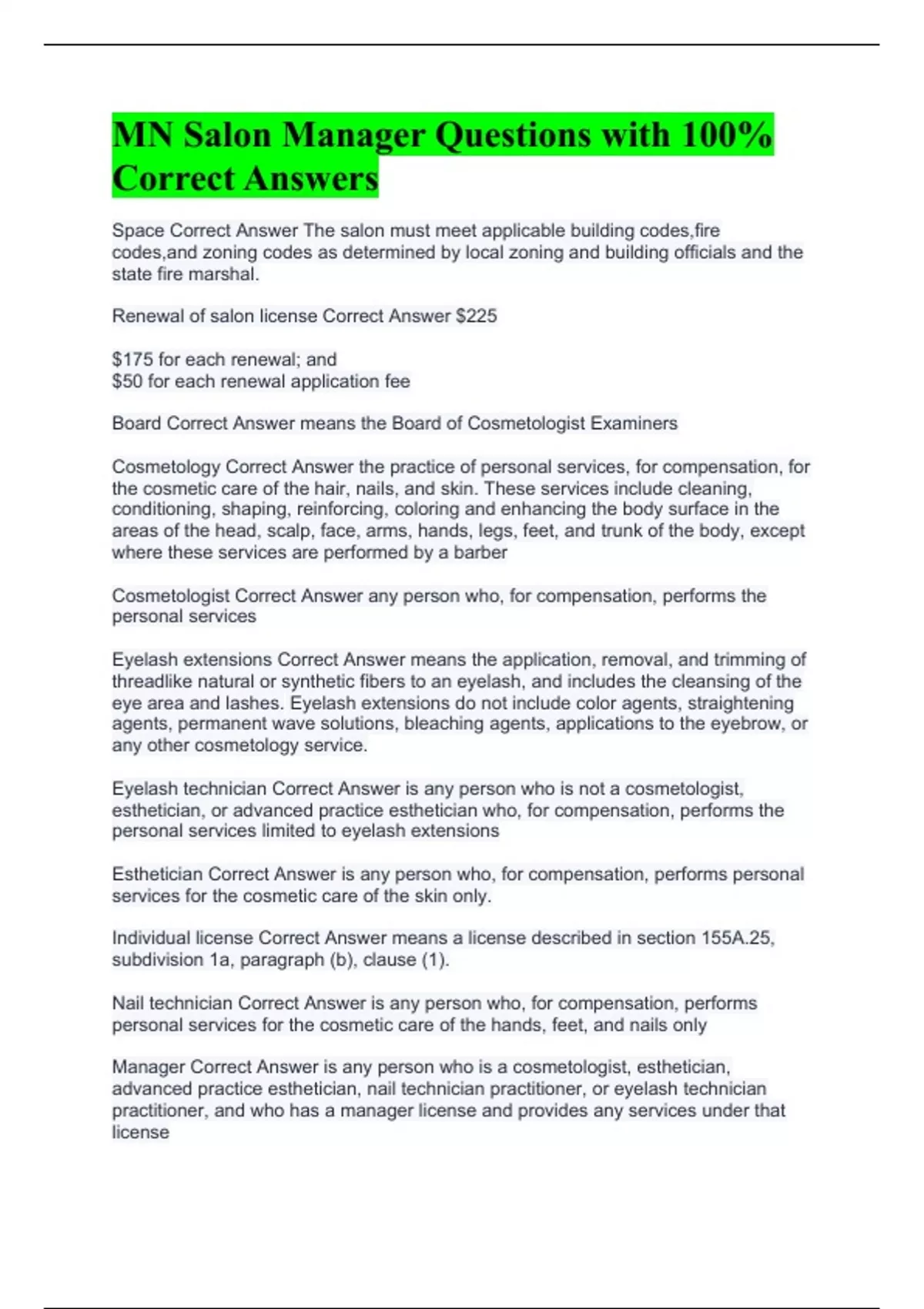 Space Correct Answer The salon must meet applicable building codes,fire codes,and zoning codes as determined by local zoning and building officials and the state fire marshal. Renewal of salon license Correct Answer $225 $175 for each renewal; and $50 for each renewal application fee Board Correct Answer means the Board of Cosmetologist Examiners Cosmetology Correct Answer the practice of personal services, for compensation, for the cosmetic care of the hair, nails, and skin. These services include cleaning, conditioning, shaping, reinforcing, coloring and enhancing the body surface in the areas of the head, scalp, face, arms, hands, legs, feet, and trunk of the body, except where these services are performed by a barber Cosmetologist Correct Answer any person who, for compensation, performs the personal services Eyelash extensions Correct Answer means the application, removal, and trimming of threadlike natural or synthetic fibers to an eyelash, and includes the cleansing of the eye area and lashes. Eyelash extensions do not include color agents, straightening agents, permanent wave solutions, bleaching agents, applications to the eyebrow, or any other cosmetology service. Eyelash technician Correct Answer is any person who is not a cosmetologist, esthetician, or advanced practice esthetician who, for compensation, performs the personal services limited to eyelash extensions Esthetician Correct Answer is any person who, for compensation, performs personal services for the cosmetic care of the skin only. Individual license Correct Answer means a license described in section 155A.25, subdivision 1a, paragraph (b), clause (1). Nail technician Correct Answer is any person who, for compensation, performs personal services for the cosmetic care of the hands, feet, and nails only Manager Correct Answer is any person who is a cosmetologist, esthetician, advanced practice esthetician, nail technician practitioner, or eyelash technician practitioner, and who has a manager license and provides any services under that license