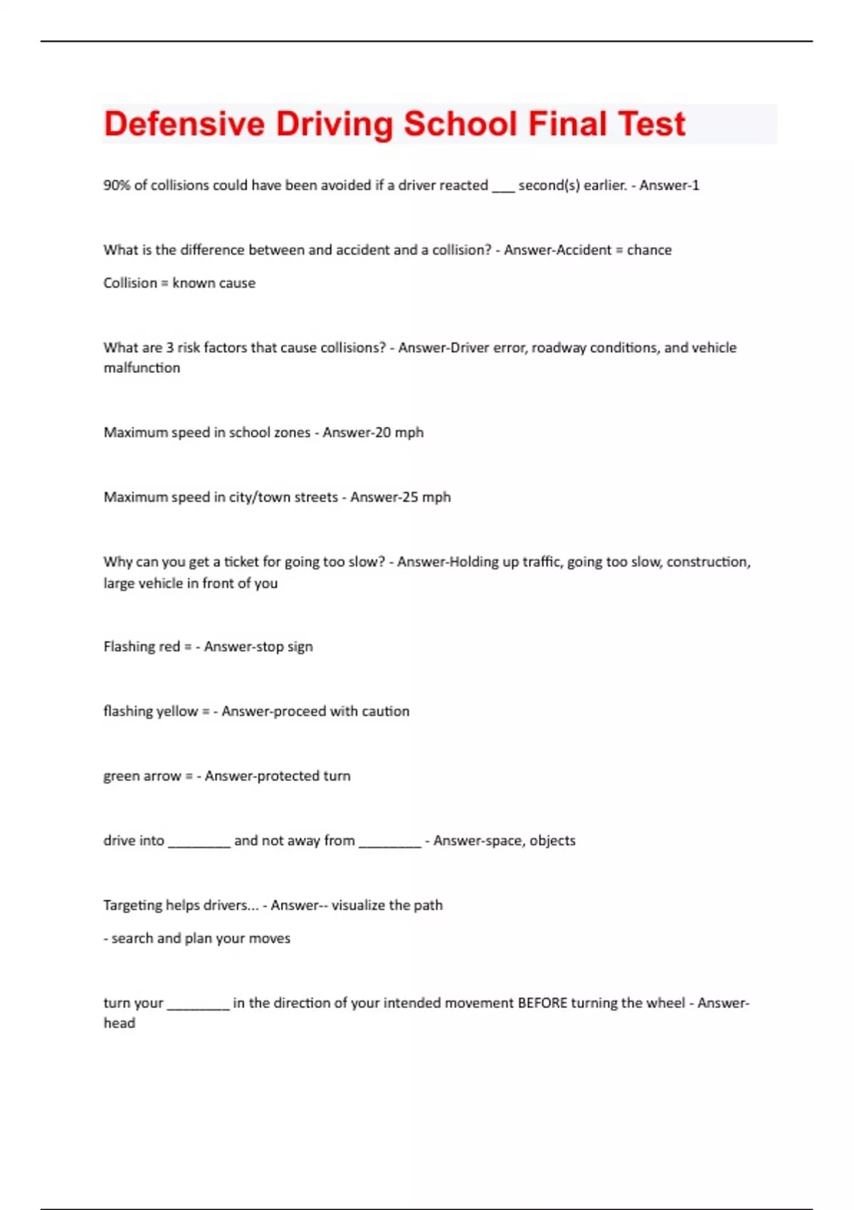Defensive Driving School Final Test Questions & Answers Solved 100% Correct!!