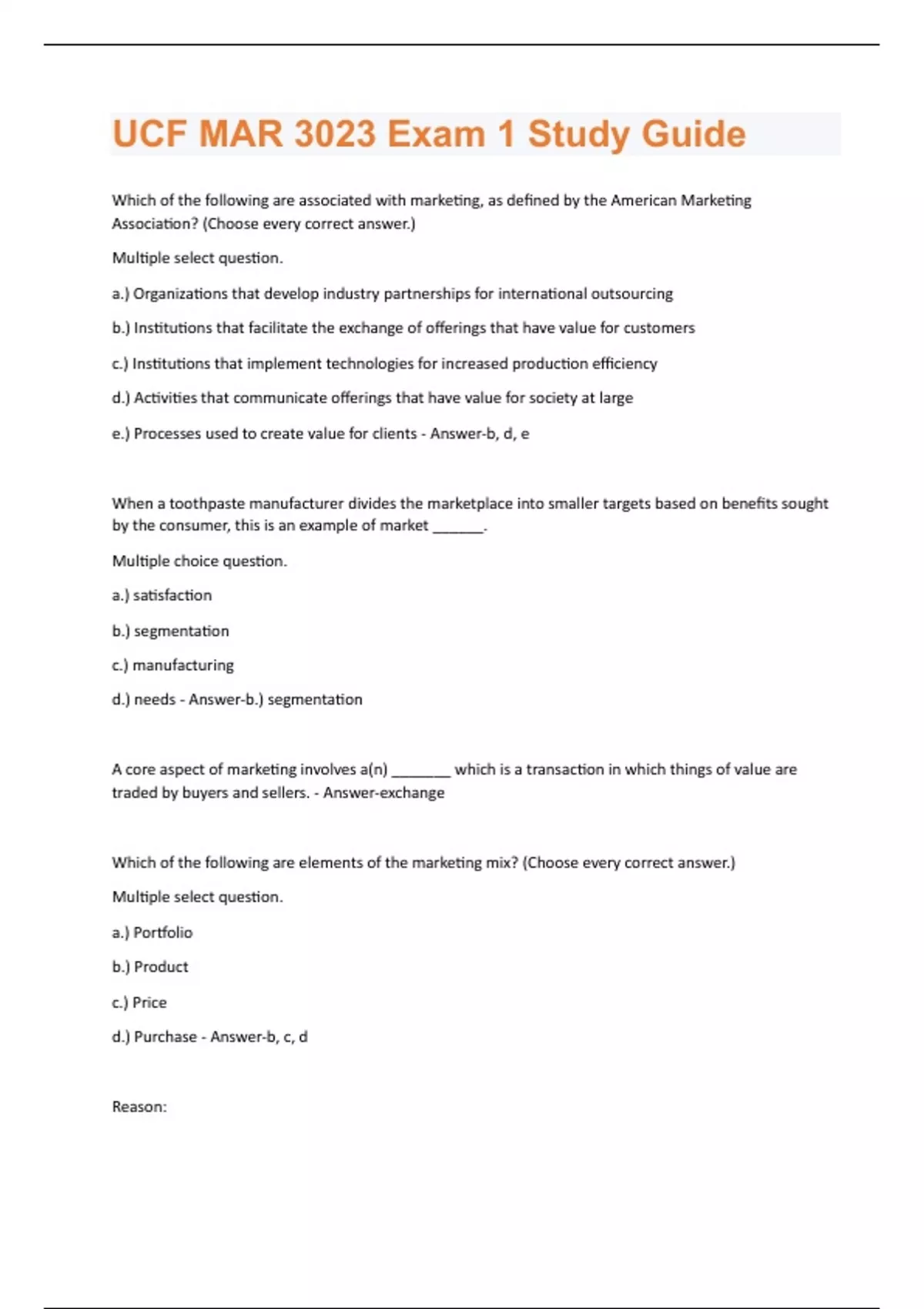Which of the following are associated with marketing, as defined by the American Marketing Association? (Choose every correct answer.) Multiple select question. a.) Organizations that develop industry partnerships for international outsourcing b.) Institutions that facilitate the exchange of offerings that have value for customers c.) Institutions that implement technologies for increased production efficiency d.) Activities that communicate offerings that have value for society at large e.) Processes used to create value for clients - Answer-b, d, e When a toothpaste manufacturer divides the marketplace into smaller targets based on benefits sought by the consumer, this is an example of market ______. Multiple choice question. a.) satisfaction b.) segmentation c.) manufacturing d.) needs - Answer-b.) segmentation A core aspect of marketing involves a(n) _______ which is a transaction in which things of value are traded by buyers and sellers. - Answer-exchange Which of the following are elements of the marketing mix? (Choose every correct answer.) Multiple select question. a.) Portfolio b.) Product c.) Price d.) Purchase - Answer-b, c, d