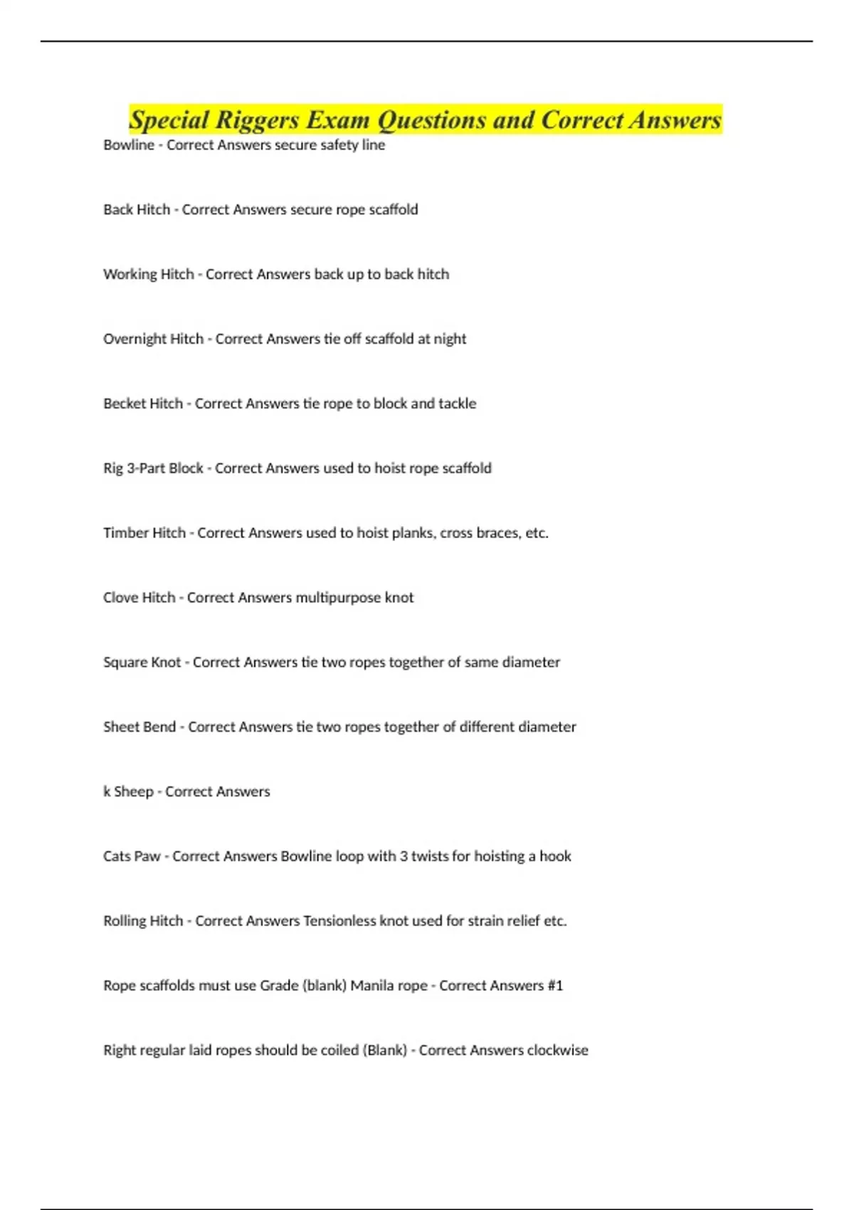 Special Riggers Exam Questions and Correct Answers Bowline - Correct Answers secure safety line Back Hitch - Correct Answers secure rope scaffold Working Hitch - Correct Answers back up to back hitch Overnight Hitch - Correct Answers tie off scaffold at night Becket Hitch - Correct Answers tie rope to block and tackle Rig 3-Part Block - Correct Answers used to hoist rope scaffold Timber Hitch - Correct Answers used to hoist planks, cross braces, etc. Clove Hitch - Correct Answers multipurpose knot Square Knot - Correct Answers tie two ropes together of same diameter Sheet Bend - Correct Answers tie two ropes together of different diameter k Sheep - Correct Answers Cats Paw - Correct Answers Bowline loop with 3 twists for hoisting a hook Rolling Hitch - Correct Answers Tensionless knot used for strain relief etc. Rope scaffolds must use Grade (blank) Manila rope - Correct Answers #1 Right regular laid ropes should be coiled (Blank) - Correct Answers clockwise Rope scaffolding must use ()" diameter rope for manila rope - Correct Answers 3/4" rope scaffolding cannot be used higher than () - Correct Answers 100' rope scaff