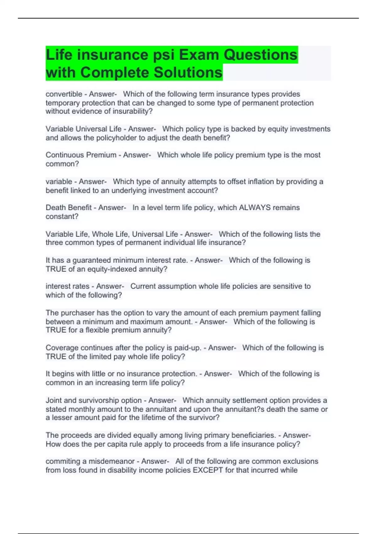 convertible - Answer- Which of the following term insurance types provides temporary protection that can be changed to some type of permanent protection without evidence of insurability? Variable Universal Life - Answer- Which policy type is backed by equity investments and allows the policyholder to adjust the death benefit? Continuous Premium - Answer- Which whole life policy premium type is the most common? variable - Answer- Which type of annuity attempts to offset inflation by providing a benefit linked to an underlying investment account? Death Benefit - Answer- In a level term life policy, which ALWAYS remains constant? Variable Life, Whole Life, Universal Life - Answer- Which of the following lists the three common types of permanent individual life insurance? It has a guaranteed minimum interest rate. - Answer- Which of the following is TRUE of an equity-indexed annuity? interest rates - Answer- Current assumption whole life policies are sensitive to which of the following? The purchaser has the option to vary the amount of each premium payment falling between a minimum and maximum amount. - Answer- Which of the following is TRUE for a flexible premium annuity? Coverage continues after the policy is paid-up. - Answer- Which of the following is TRUE of the limited pay whole life policy? It begins with little or no insurance protection. - Answer- Which of the following is common in an increasing term life policy? Joint and survivorship option - Answer- Which annuity settlement option provides a stated monthly amount to the annuitant and upon the annuitant?s death the same or a lesser amount paid for the lifetime of the survivor? The proceeds are divided equally among living primary beneficiaries. - Answer- How does the per capita rule apply to proceeds from a life insurance policy? commiting a misdemeanor - Answer- All of the following are common exclusions from loss found in disability income policies EXCEPT for that incurred while
