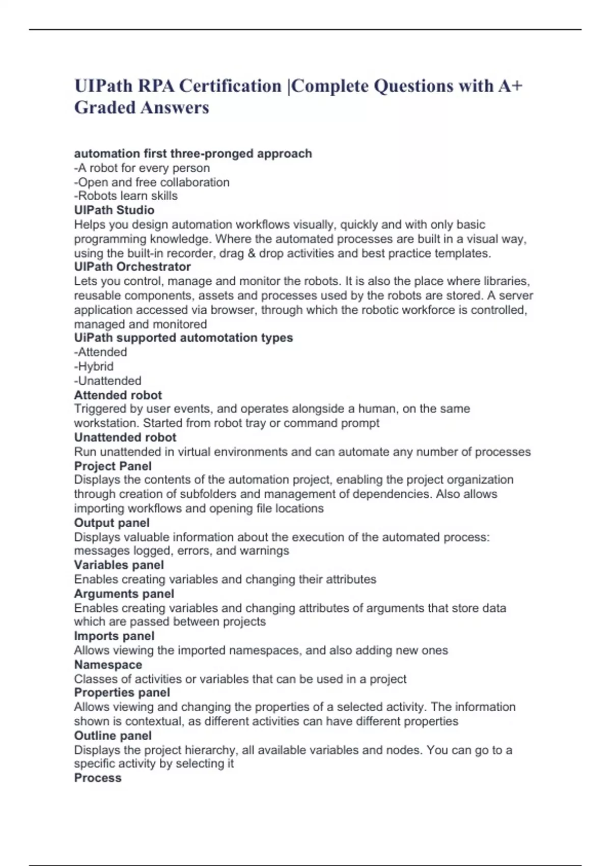 UIPath RPA Certification |Complete Questions with A+ Graded Answers automation first three-pronged approach -A robot for every person -Open and free collaboration -Robots learn skills UIPath Studio Helps you design automation workflows visually, quickly and with only basic programming knowledge. Where the automated processes are built in a visual way, using the built-in recorder, drag & drop activities and best practice templates. UIPath Orchestrator Lets you control, manage and monitor the robots. It is also the place where libraries, reusable components, assets and processes used by the robots are stored. A server application accessed via browser, through which the robotic workforce is controlled, managed and monitored UiPath supported automotation types -Attended -Hybrid -Unattended Attended robot Triggered by user events, and operates alongside a human, on the same workstation. Started from robot tray or command prompt Unattended robot Run unattended in virtual environments and can automate any number of processes Project Panel Displays the contents of the automation project, enabling the project organization through creation of subfolders and management of dependencies. Also allows importing workflows and opening file locations Output panel Displays valuable information about the execution of the automated process: messages logged, errors, and warnings Variables panel Enables creating variables and changing their attributes Arguments panel Enables creating variables and changing attributes of arguments that store data which are passed between projects Imports panel Allows viewing the imported namespaces, and also adding new ones Namespace Classes of activities or variables that can be used in a project Properties panel Allows viewing and changing the properties of a selected activity. The information shown is contextual, as different activities can have different properties Outline panel Displays the project hierarchy, all available variables and nodes. You can go to a specific activity by selecting it Process