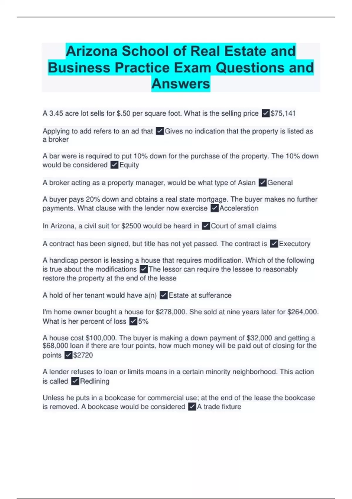 Arizona School of Real Estate and Business Practice Exam Questions and Answers