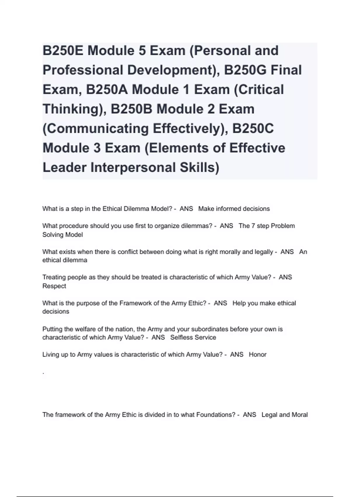 B250E Module 5 Exam (Personal and Professional Development), B250G Final Exam, B250A Module 1 Exam (Critical Thinking), B250B Module 2 Exam (Communicating Effectively), B250C Module 3 Exam (Elements of Effective Leader Interpersonal Skills)