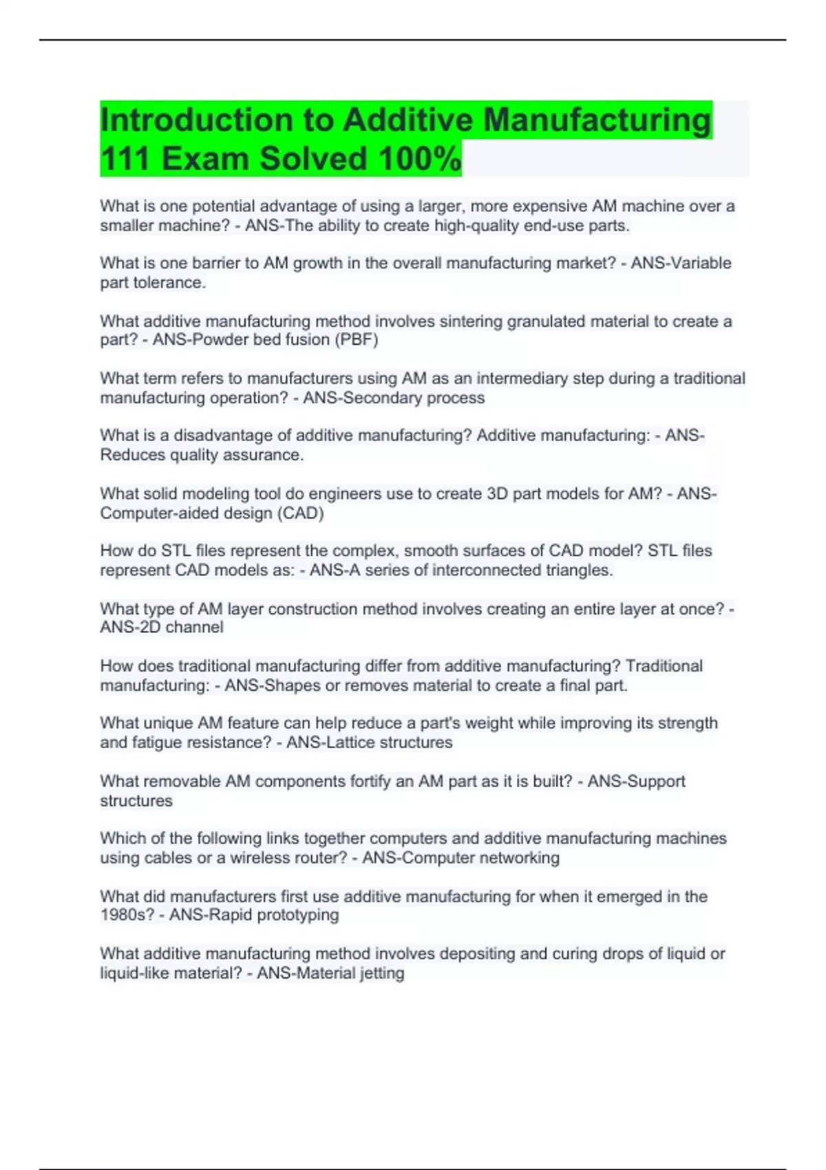 Introduction to Additive Manufacturing 111 Exam Solved 100%