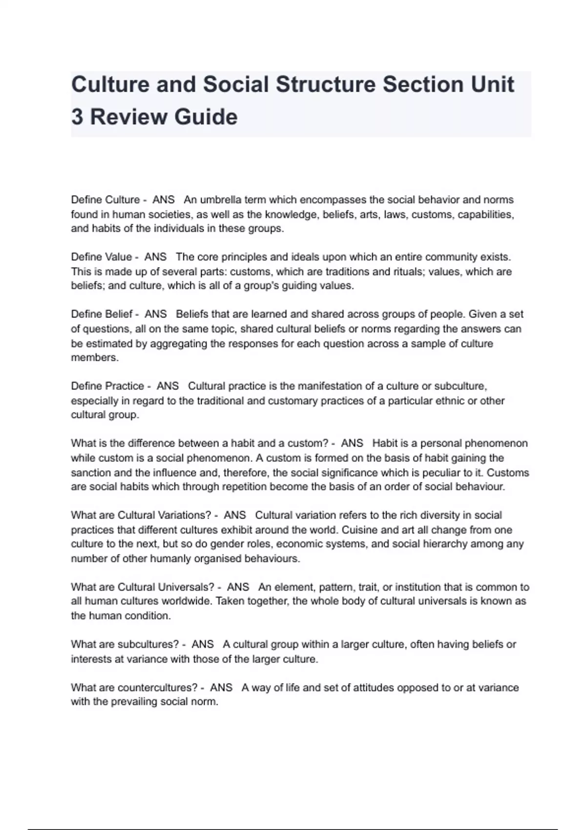 Culture and Social Structure Section Unit 3 Review Guide Exam Questions And Answers Define Culture - ANS An umbrella term which encompasses the social behavior and norms found in human societies, as well as the knowledge, beliefs, arts, laws, customs, capabilities, and habits of the individuals in these groups. Define Value - ANS The core principles and ideals upon which an entire community exists. This is made up of several parts: customs, which are traditions and rituals; values, which are beliefs; and culture, which is all of a group's guiding values. Define Belief - ANS Beliefs that are learned and shared across groups of people. Given a set of questions, all on the same topic, shared cultural beliefs or norms regarding the answers can be estimated by aggregating the responses for each question across a sample of culture members. Define Practice - ANS Cultural practice is the manifestation of a culture or subculture, especially in regard to the traditional and customary practices of a particular ethnic or other cultural group. What is the difference between a habit and a custom? - ANS Habit is a personal phenomenon while custom is a social phenomenon. A custom is formed on the basis of habit gaining the sanction and the influence and, therefore, the social significance which is peculiar to it. Customs are social habits which through repetition become the basis of an order of social behaviour. What are Cultural Variations? - ANS Cultural variation refers to the rich diversity in social practices that different cultures exhibit around the world. Cuisine and art all change from one culture to the next, but so do gender roles, economic systems, and social hierarchy among any number of other humanly organised behaviours. What are Cultural Universals? - ANS An element, pattern, trait, or institution that is common to all human cultures worldwide. Taken together, the whole body of cultural universals is known as the human condition. What are subcultures? - ANS A cultural group within a larger culture, often having beliefs or interests at variance with those of the larger culture. What are countercultures? - ANS A way of life and set of attitudes opposed to or at variance with the prevailing social norm.