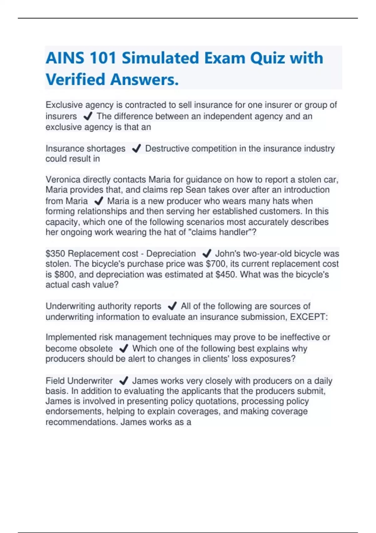 Exclusive agency is contracted to sell insurance for one insurer or group of insurers ️ The difference between an independent agency and an exclusive agency is that an Insurance shortages ️ Destructive competition in the insurance industry could result in Veronica directly contacts Maria for guidance on how to report a stolen car, Maria provides that, and claims rep Sean takes over after an introduction from Maria ️ Maria is a new producer who wears many hats when forming relationships and then serving her established customers. In this capacity, which one of the following scenarios most accurately describes her ongoing work wearing the hat of "claims handler"? $350 Replacement cost - Depreciation ️ John's two-year-old bicycle was stolen. The bicycle's purchase price was $700, its current replacement cost is $800, and depreciation was estimated at $450. What was the bicycle's actual cash value? Underwriting authority reports ️ All of the following are sources of underwriting information to evaluate an insurance submission, EXCEPT: Implemented risk management techniques may prove to be ineffective or become obsolete ️ Which one of the following best explains why producers should be alert to changes in clients' loss exposures? Field Underwriter ️ James works very closely with producers on a daily basis. In addition to evaluating the applicants that the producers submit, James is involved in presenting policy quotations, processing policy endorsements, helping to explain coverages, and making coverage recommendations. James works as a AINS 101 Simulated Exam Quiz with Verified Answers | Latest 2024/2025