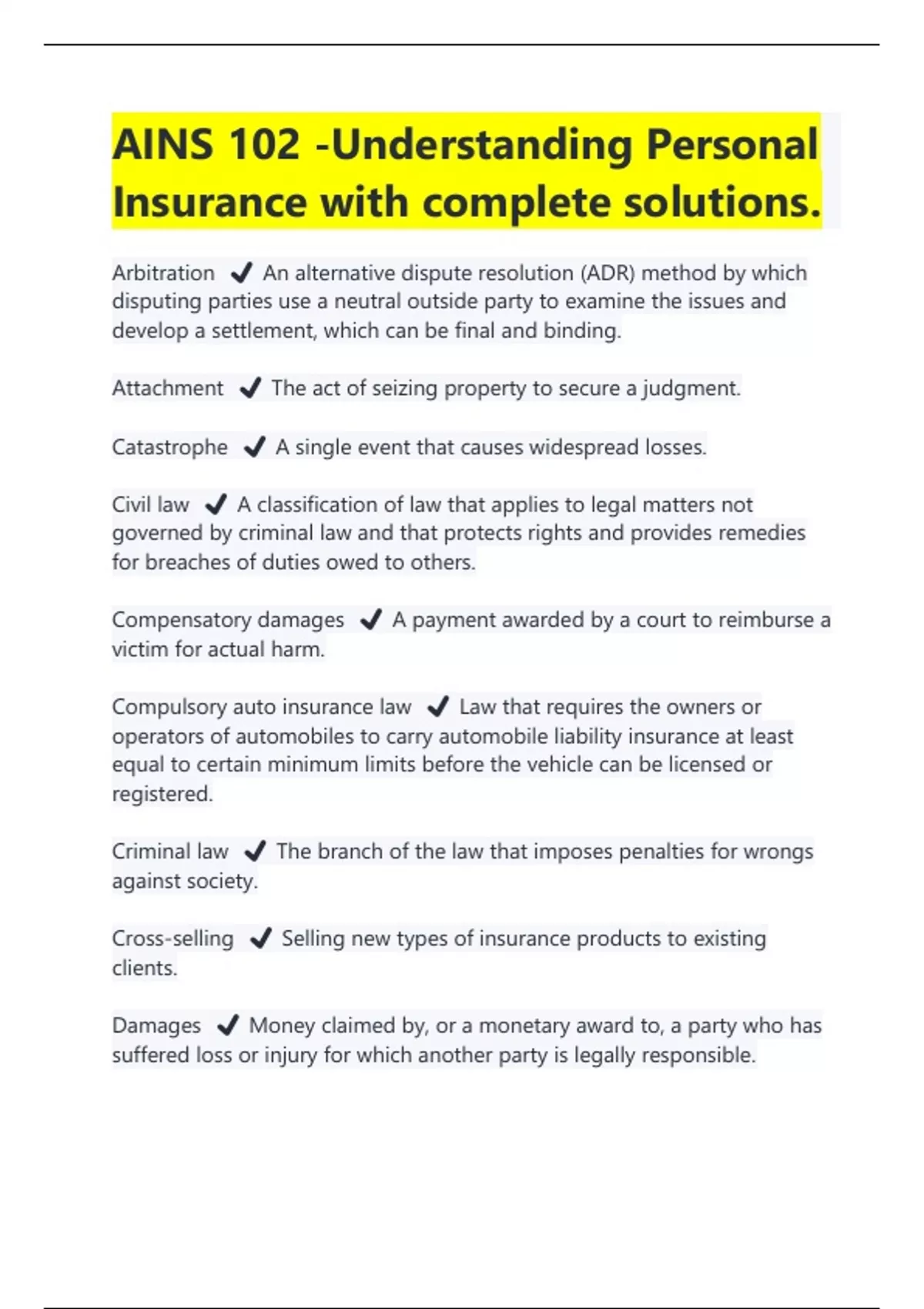 Arbitration ️ An alternative dispute resolution (ADR) method by which disputing parties use a neutral outside party to examine the issues and develop a settlement, which can be final and binding. Attachment ️ The act of seizing property to secure a judgment. Catastrophe ️ A single event that causes widespread losses. Civil law ️ A classification of law that applies to legal matters not governed by criminal law and that protects rights and provides remedies for breaches of duties owed to others. Compensatory damages ️ A payment awarded by a court to reimburse a victim for actual harm. Compulsory auto insurance law ️ Law that requires the owners or operators of automobiles to carry automobile liability insurance at least equal to certain minimum limits before the vehicle can be licensed or registered. Criminal law ️ The branch of the law that imposes penalties for wrongs against society. Cross-selling ️ Selling new types of insurance products to existing clients. Damages ️ Money claimed by, or a monetary award to, a party who has suffered loss or injury for which another party is legally responsible. Deductible ️ A portion of a covered loss that is not paid by the insurer. Financial responsibility laws ️ Law enacted to ensure that motorists have the financial ability to pay for any property damage or bodily injury they might cause as a result of driving or owning an auto. First party ️ The insured in an insurance contract. Floater ️ A policy designed to cover property that floats, or moves, from location to location. Flood Insurance Rate Map (FIRM) ️ A map that shows exact boundaries for special flood hazard areas, the various flood zones, and base flood elevations. General damages ️ A monetary award to compensate a victim for losses, such as pain and suffering, that do not involve specific, measurable expenses. AINS 102 -Understanding Personal Insurance with complete solutions |Latest 2024/2025