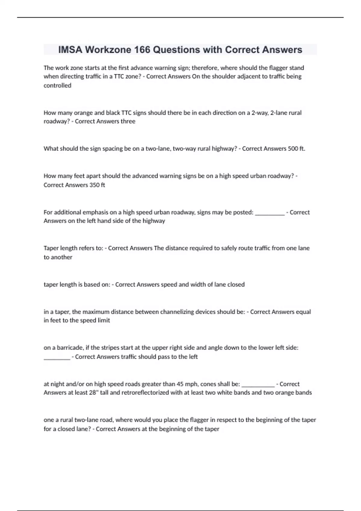IMSA Workzone 166 Questions with Correct Answers The work zone starts at the first advance warning sign; therefore, where should the flagger stand when directing traffic in a TTC zone? - Correct Answers On the shoulder adjacent to traffic being controlled How many orange and black TTC signs should there be in each direction on a 2-way, 2-lane rural roadway? - Correct Answers three What should the sign spacing be on a two-lane, two-way rural highway? - Correct Answers 500 ft. How many feet apart should the advanced warning signs be on a high speed urban roadway? - Correct Answers 350 ft For additional emphasis on a high speed urban roadway, signs may be posted: _________ - Correct Answers on the left hand side of the highway Taper length refers to: - Correct Answers The distance required to safely route traffic from one lane to another taper length is based on: - Correct Answers speed and width of lane closed in a taper, the maximum distance between channelizing devices should be: - Correct Answers equal in feet to the speed limit on a barricade, if the stripes start at the upper right side and angle down to the lower left side: ________ - Correct Answers traffic should pass to the left at night and/or on high speed roads greater than 45 mph, cones shall be: __________ - Correct Answers at least 28" tall and retroreflectorized with at least two white bands and two orange bands one a rural two-lane road, where would you place the flagger in respect to the beginning of the taper for a closed lane? - Correct Answers at the beginning of the taper