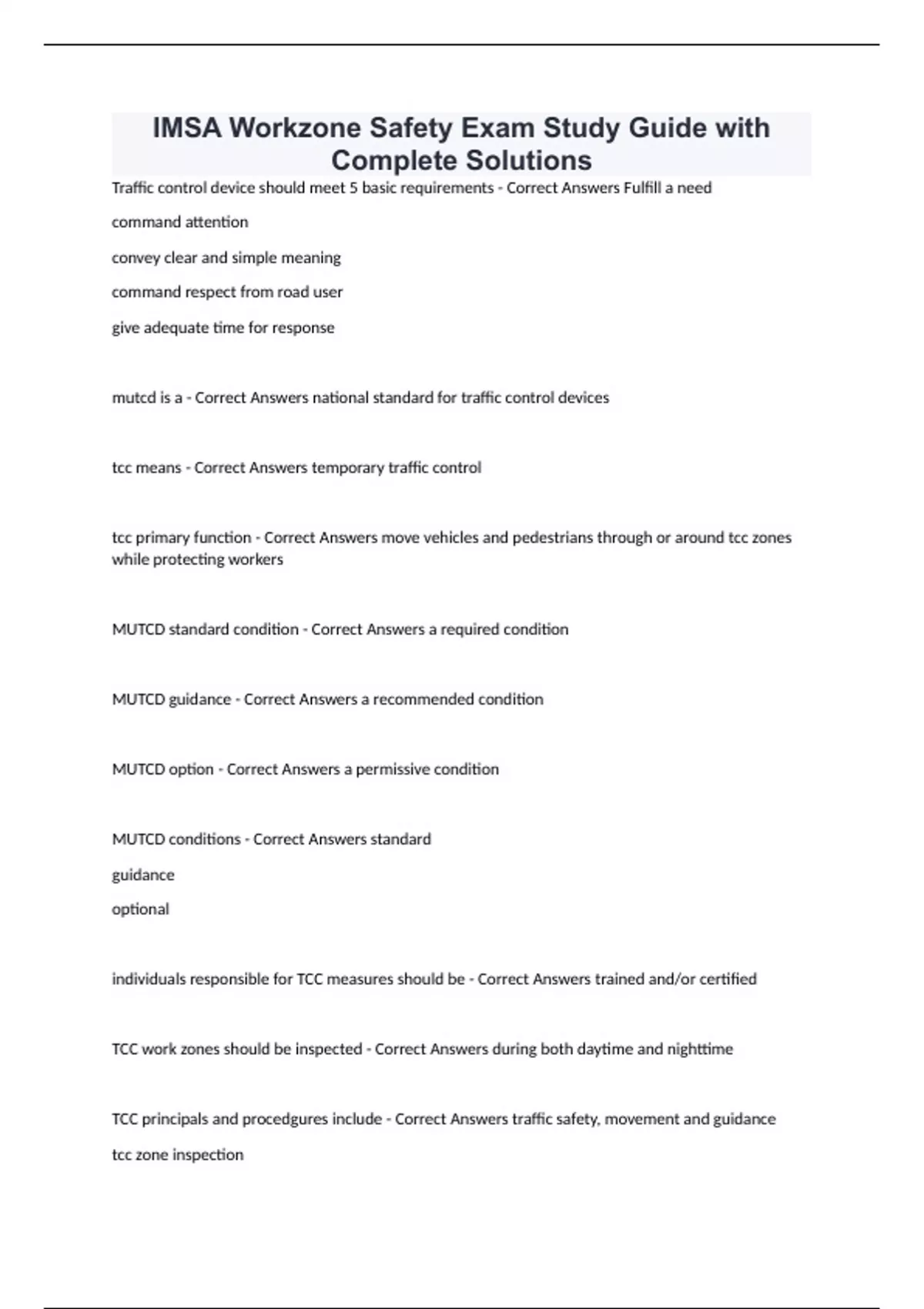 IMSA Workzone Safety Exam Study Guide with Complete Solutions Traffic control device should meet 5 basic requirements - Correct Answers Fulfill a need command attention convey clear and simple meaning command respect from road user give adequate time for response mutcd is a - Correct Answers national standard for traffic control devices tcc means - Correct Answers temporary traffic control tcc primary function - Correct Answers move vehicles and pedestrians through or around tcc zones while protecting workers MUTCD standard condition - Correct Answers a required condition MUTCD guidance - Correct Answers a recommended condition MUTCD option - Correct Answers a permissive condition MUTCD conditions - Correct Answers standard guidance optional individuals responsible for TCC measures should be - Correct Answers trained and/or certified TCC work zones should be inspected - Correct Answers during both daytime and nighttime TCC principals and procedgures include - Correct Answers traffic safety, movement and guidance