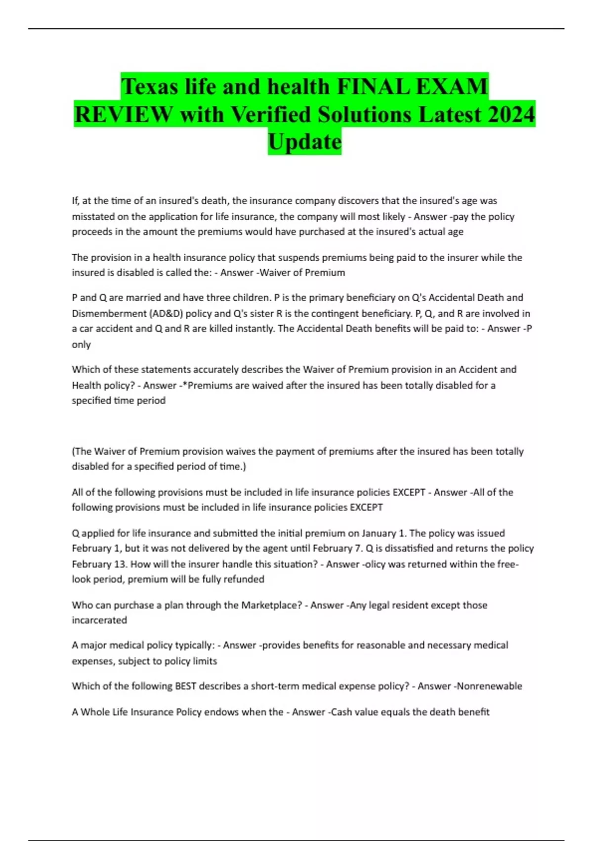 Texas life and health FINAL EXAM REVIEW with Verified Solutions Latest 2024 Update If, at the time of an insured's death, the insurance company discovers that the insured's age was misstated on the application for life insurance, the company will most likely - Answer -pay the policy proceeds in the amount the premiums would have purchased at the insured's actual age The provision in a health insurance policy that suspends premiums being paid to the insurer while the insured is disabled is called the: - Answer -Waiver of Premium P and Q are married and have three children. P is the primary beneficiary on Q's Accidental Death and Dismemberment (AD&D) policy and Q's sister R is the contingent beneficiary. P, Q, and R are involved in a car accident and Q and R are killed instantly. The Accidental Death benefits will be paid to: - Answer -P only Which of these statements accurately describes the Waiver of Premium provision in an Accident and Health policy? - Answer -*Premiums are waived after the insured has been totally disabled for a specified time period (The Waiver of Premium provision waives the payment of premiums after the insured has been totally disabled for a specified period of time.) All of the following provisions must be included in life insurance policies EXCEPT - Answer -All of the following provisions must be included in life insurance policies EXCEPT Q applied for life insurance and submitted the initial premium on January 1. The policy was issued February 1, but it was not delivered by the agent until February 7. Q is dissatisfied and returns the policy February 13. How will the insurer handle this situation? - Answer -olicy was returned within the freelook period, premium will be fully refunded Who can purchase a plan through the Marketplace? - Answer -Any legal resident except those incarcerated A major medical policy typically: - Answer -provides benefits for reasonable and necessary medical expenses, subject to policy limits Which of the following BEST describes a short-term medical expense policy? - Answer -Nonrenew
