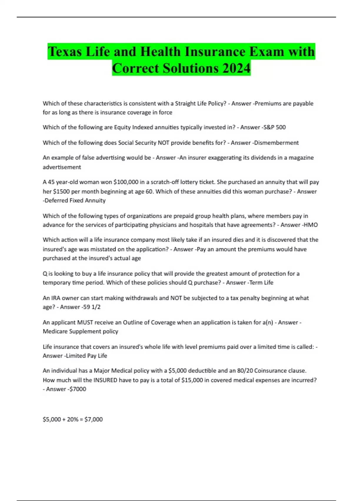 Texas Life and Health Insurance Exam with Correct Solutions 2024 Which of these characteristics is consistent with a Straight Life Policy? - Answer -Premiums are payable for as long as there is insurance coverage in force Which of the following are Equity Indexed annuities typically invested in? - Answer -S&P 500 Which of the following does Social Security NOT provide benefits for? - Answer -Dismemberment An example of false advertising would be - Answer -An insurer exaggerating its dividends in a magazine advertisement A 45 year-old woman won $100,000 in a scratch-off lottery ticket. She purchased an annuity that will pay her $1500 per month beginning at age 60. Which of these annuities did this woman purchase? - Answer -Deferred Fixed Annuity Which of the following types of organizations are prepaid group health plans, where members pay in advance for the services of participating physicians and hospitals that have agreements? - Answer -HMO Which action will a life insurance company most likely take if an insured dies and it is discovered that the insured's age was misstated on the application? - Answer -Pay an amount the premiums would have purchased at the insured's actual age Q is looking to buy a life insurance policy that will provide the greatest amount of protection for a temporary time period. Which of these policies should Q purchase? - Answer -Term Life An IRA owner can start making withdrawals and NOT be subjected to a tax penalty beginning at what age? - Answer -59 1/2 An applicant MUST receive an Outline of Coverage when an application is taken for a(n) - Answer - Medicare Supplement policy Life insurance that covers an insured's whole life with level premiums paid over a limited time is called: - Answer -Limited Pay Life An individual has a Major Medical policy with a $5,000 deductible and an 80/20 Coinsurance clause. How much will the INSURED have to pay is a total of $15,000 in covered medical expenses are incurred? - Answer -$7000 $5,000 + 20% = $7,000