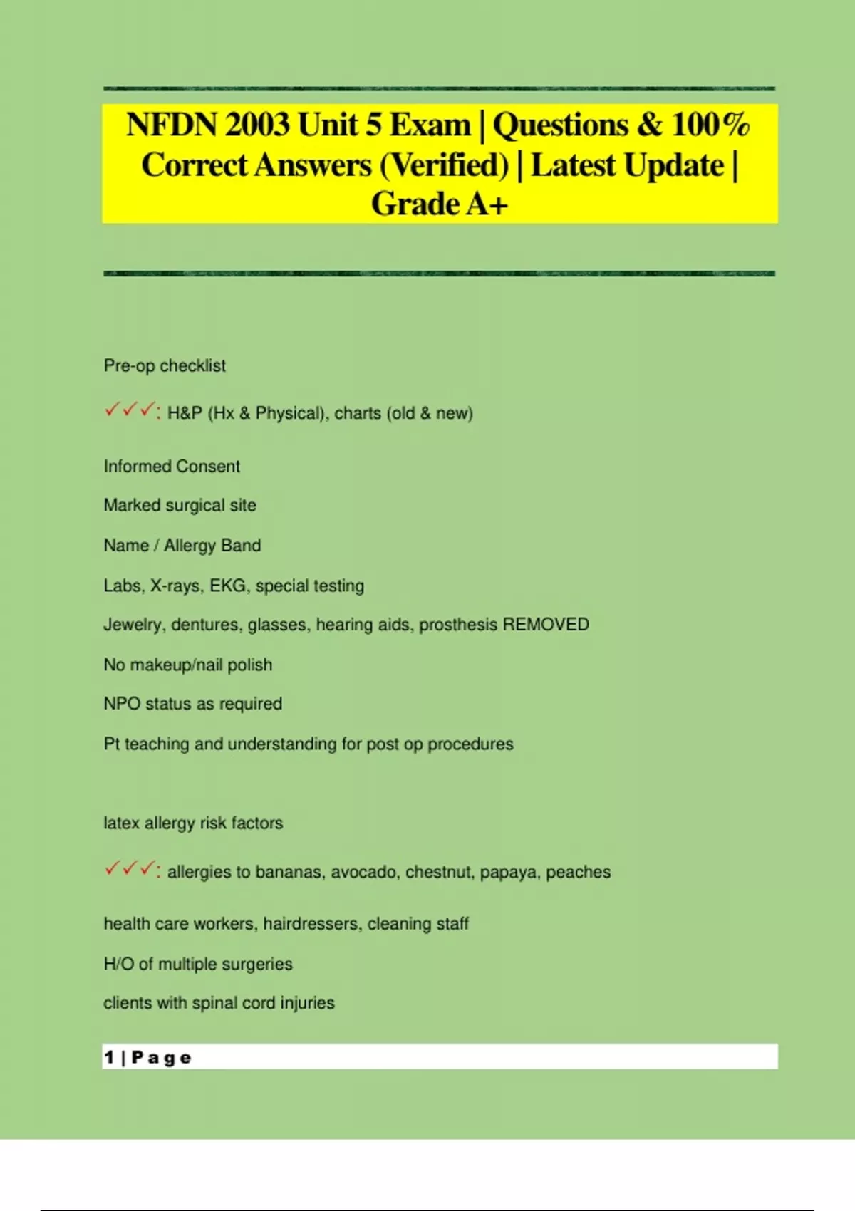 Pre-op checklist : H&P (Hx & Physical), charts (old & new) Informed Consent Marked surgical site Name / Allergy Band Labs, X-rays, EKG, special testing Jewelry, dentures, glasses, hearing aids, prosthesis REMOVED No makeup/nail polish NPO status as required Pt teaching and understanding for post op procedures latex allergy risk factors : allergies to bananas, avocado, chestnut, papaya, peaches health care workers, hairdressers, cleaning staff H/O of multiple surgeries clients with spinal cord injuries 2 | P a g e clients with urogenital abnormalities Patient Valuables Envelope : envelope signed by the patient and nurse that contains the patient's valuables; locked up in the med roo