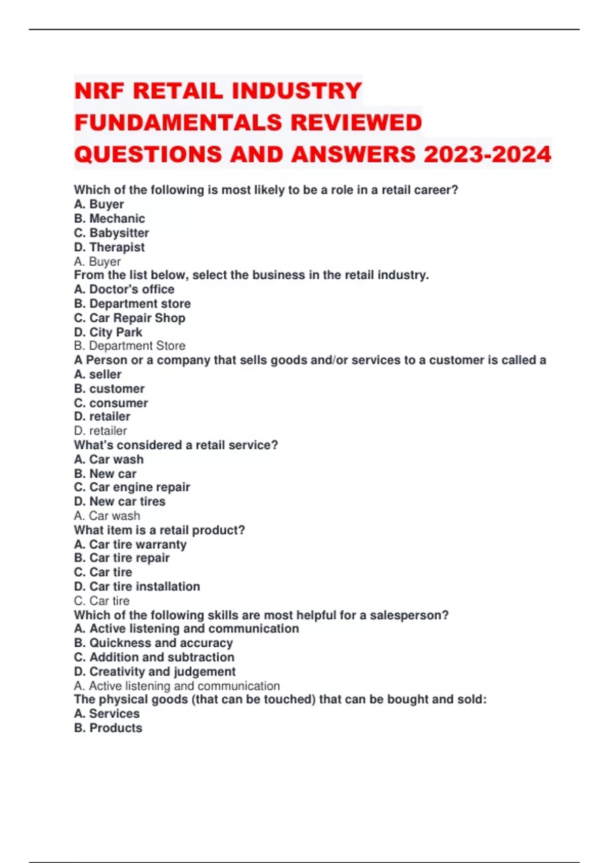 NRF RETAIL INDUSTRY FUNDAMENTALS REVIEWED QUESTIONS AND ANSWERS Which of the following is most likely to be a role in a retail career? A. Buyer B. Mechanic C. Babysitter D. Therapist A. Buyer From the list below, select the business in the retail industry. A. Doctor's office B. Department store C. Car Repair Shop D. City Park B. Department Store A Person or a company that sells goods and/or services to a customer is called a A. seller B. customer C. consumer D. retailer D. retailer What's considered a retail service? A. Car wash B. New car C. Car engine repair D. New car tires A. Car wash What item is a retail product? A. Car tire warranty B. Car tire repair C. Car tire D. Car tire installation C. Car tire Which of the following skills are most helpful for a salesperson? A. Active listening and communication B. Quickness and accuracy C. Addition and subtraction D. Creativity and judgement A. Active listening and communication The physical goods (that can be touched) that can be bought and sold: A. Services B. Products
