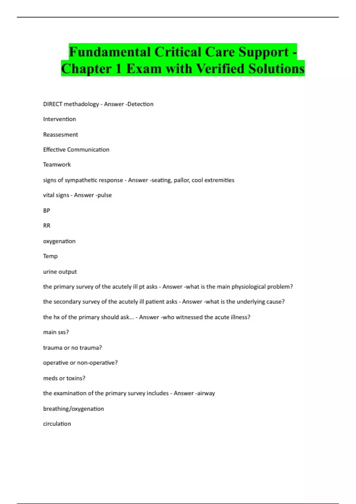 Fundamental Critical Care Support - Chapter 1 Exam with Verified Solutions DIRECT methadology - Answer -Detection Intervention Reassesment Effective Communication Teamwork signs of sympathetic response - Answer -seating, pallor, cool extremities vital signs - Answer -pulse BP RR oxygenation Temp urine output the primary survey of the acutely ill pt asks - Answer -what is the main physiological problem? the secondary survey of the acutely ill patient asks - Answer -what is the underlying cause? the hx of the primary should ask... - Answer -who witnessed the acute illness? main sxs? trauma or no trauma? operative or non-operative? meds or toxins? the examination of the primary survey includes - Answer -a