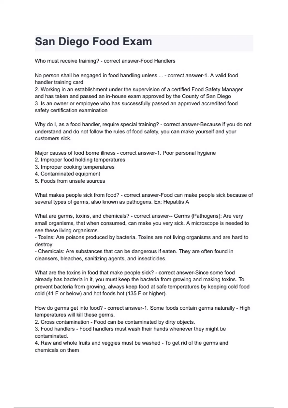 Exam of 5 pages for the course food handlers at food handlers (San Diego Food Exam)