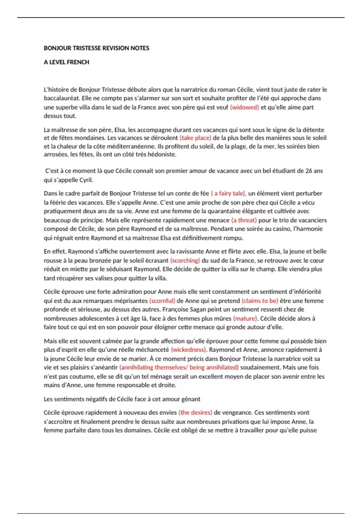 My revision notes: Bonjour Tristesse: A LEVEL FRENCH