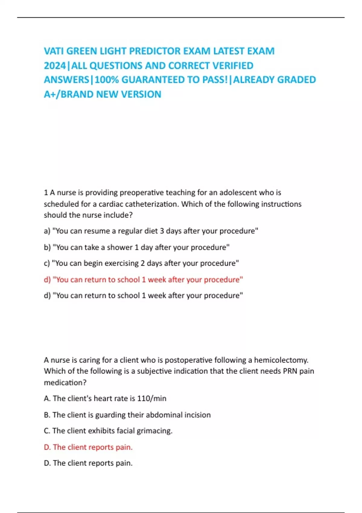 VATI GREEN LIGHT PREDICTOR EXAM LATEST EXAM 2024|ALL QUESTIONS AND CORRECT VERIFIED ANSWERS|100% GUARANTEED TO PASS!|ALREADY GRADED A+/BRAND NEW VERSION