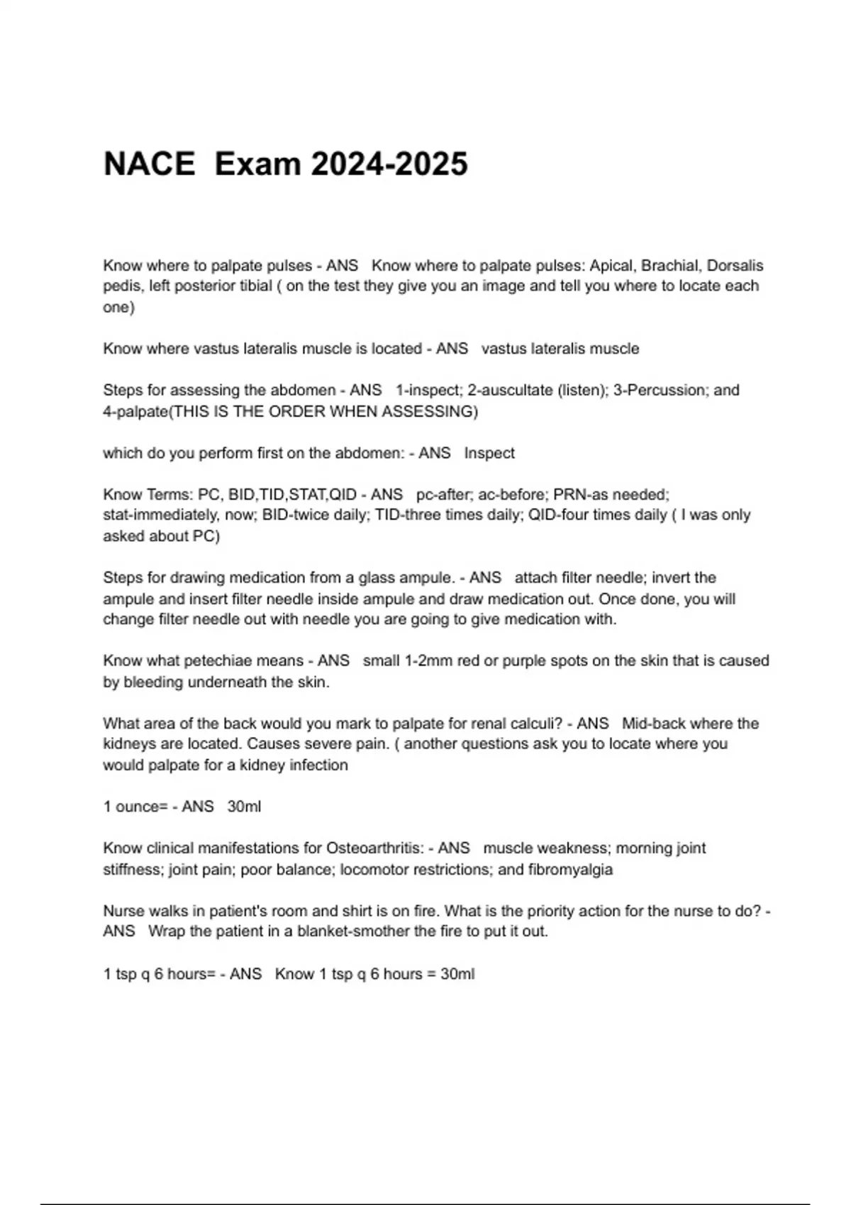 NACE Exam Know where to palpate pulses - ANS Know where to palpate pulses: Apical, Brachial, Dorsalis pedis, left posterior tibial ( on the test they give you an image and tell you where to locate each one) Know where vastus lateralis muscle is located - ANS vastus lateralis muscle Steps for assessing the abdomen - ANS 1-inspect; 2-auscultate (listen); 3-Percussion; and 4-palpate(THIS IS THE ORDER WHEN ASSESSING) which do you perform first on the abdomen: - ANS Inspect Know Terms: PC, BID,TID,STAT,QID - ANS pc-after; ac-before; PRN-as needed; stat-immediately, now; BID-twice daily; TID-three times daily; QID-four times daily ( I was only asked about PC) Steps for drawing medication from a glass ampule. - ANS attach filter needle; invert the ampule and insert filter needle inside ampule and draw medication out. Once done, you will change filter needle out with needle you are going to give medication with. Know what petechiae means - ANS small 1-2mm red or purple spots on the skin that is caused by bleeding underneath the skin. What area of the back would you mark to palpate for renal calculi? - ANS Mid-back where the kidneys are located. Causes severe pain. ( another questions ask you to locate where you would palpate for a kidney infection 1 ounce= - ANS 30ml Know clinical manifestations for Osteoarthritis: - ANS muscle weakness; morning joint stiffness; joint pain; poor balance; locomotor restrictions; and fibromyalgia Nurse walks in patient's room and shirt is on fire. What is the priority action for the nurse to do? - ANS Wrap the patient in a blanket-smother the fire to put it out. 1 tsp q 6 hours= - ANS Know 1 tsp q 6 hours = 30ml If patient is taking Coumadin, what lab value will the nurse have to check? - ANS If patient is taking Coumadin, what lab value will the nurse have to check? INR-2.8 What part of the nursing process would the nurse come up with a nursing diagnoses? a. Assessment b. Analysis c. Implement d. Evaluation - ANS Analysis 1 liter of fluid at 1100 is going at 125ml/hr. What time will the next bag of fluids be hung? - ANS 1900hrs Patient is taking Alendronate for osteoporosis. What diet the patient choose, lets you know they understand what to eat when taking this medication? a. Turnup greens, salmon b. Take first thing in the morning with 6-8 ounces of milk c. Take 30 minutes before other medications and food d. Only take with plain water - ANS Turnip greens, salmon Take 30 minutes before other medication Only take with plain water Patient's order states to give digoxin 0.125mg and what's ordered is digoxin 0.05. How many mg of digoxin will the patient receive? - ANS l/0.05 x 0.125 =2.5 mg Remember orderxdosage Doctor asks the nurse on the elevator how is his patient in room 913 doing? What is the nurses' response? - ANS Let's step off the elevator to discuss this A patient is having a grand mal seizure and is found unconscious. What will the nurse do first? - ANS Protect the patient from injury (loosen neck tie) Hold head in lap if on the floor; then position the patient to provide a patient airway What size gauge needles you would use to give intramuscular injections? - ANS Gauges 22-25 needles (in the muscles) What size gauge needle would you use to give Subcutaneous injections? - ANS Gauges 23-25 needles. Subcutaneous injections are given in fatty tissue over triceps Subjective Data - ANS things a person tells you about that you cannot observe through your senses; symptoms; patient tells you how/what they feel: pain, ex. Patient states he feels dizzy and patient said he fell down the stairs, itching. Objective Data - ANS information that is seen, heard, felt, or smelled by an observer; signs. Examples: bleeding, heart rate, wound appearance, blood pressure, respirations, ambulation description, hives, abdominal distention, vomiting. This is what you observe. A co-worker of a patient who is hospitalized called and asked the diagnosis of the patient in the hospital. What is the nurses response? - ANS You have to contact the hospital's contact person. The nurse was asked by a patient to pray with them. What is the nurses response? - ANS I don't feel comfortable but will find someone else who does feel comfortable praying with you. How long should you wash your hands when soiled? - ANS 15 seconds What are the two identifiers used to identify - ANS The patient's name and date of birth. Given 30meq/ml per 20meq/10ml of diluting solution. How much D5W would be added? - ANS 10mL/20meq x 30meq/mL=15 would be added What insulins are given via intravenous (IV) route a. Humulin R b. Novolin R c. Regular Insulin - ANS Humilin R A total of 3800ml of fluids have been infused. The infusing rate is 200ml/12hrs. How much fluid have been infused? - ANS 1400ml has been infused Steps to walking with a quad cane? (Know all steps.? - ANS Hold the quad cane in the hand opposite your injured or weaker leg (stronger side). Make sure the flat side of the quad cane is closest to your body. Place all four legs of the quad cane on the ground when you move it forward. The cane should be about one step length ahead of you. Keep close to body for support and balance. Step forward with weaker leg. Support your weight with both the quad cane and your injured leg. Step through with your stronger leg. Evisceration - ANS wound separation with protrusion of organs and require immediate attention. Dehiscence - ANS Wound edges are separated and no longer meet. No organs protruding. NG tube placement is verified before administering tube feedings via? - ANS NG tube placement is verified before administering tube feeding via :X-ray Heparin administration - ANS Administered via IV or subcutaneous, DO NOT ASPIRATE NEEDLE. Antidote for heparin overdose - ANS The antidote for this is: Protamine SULFATE A patient who is laying down gets up Post Op complains of feeling light headed the nurse suspect. - ANS Orthostatic hypotension Which oxygen saturation requires emergency attention from a MD with a patient w