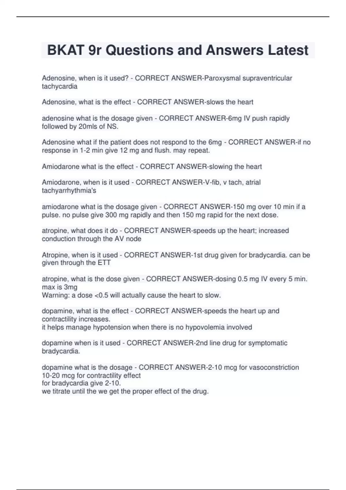 BKAT 9r Questions and Answers Latest Adenosine, when is it used? - CORRECT ANSWER-Paroxysmal supraventricular tachycardia Adenosine, what is the effect - CORRECT ANSWER-slows the heart adenosine what is the dosage given - CORRECT ANSWER-6mg IV push rapidly followed by 20mls of NS. Adenosine what if the patient does not respond to the 6mg - CORRECT ANSWER-if no response in 1-2 min give 12 mg and flush. may repeat. Amiodarone what is the effect - CORRECT ANSWER-slowing the heart Amiodarone, when is it used - CORRECT ANSWER-V-fib, v tach, atrial tachyarrhythmia's amiodarone what is the dosage given - CORRECT ANSWER-150 mg over 10 min if a pulse. no pulse give 300 mg rapidly and then 150 mg rapid for the next dose. atropine, what does it do - CORRECT ANSWER-speeds up the heart; increased conduction through the AV node Atropine, when is it used - CORRECT ANSWER-1st drug given for bradycardia. can be given through the ETT atropine, what is the dose given - CORRECT ANSWER-dosing 0.5 mg IV every 5 min. max is 3mg Warning: a dose <0.5 will actually cause the heart to slow