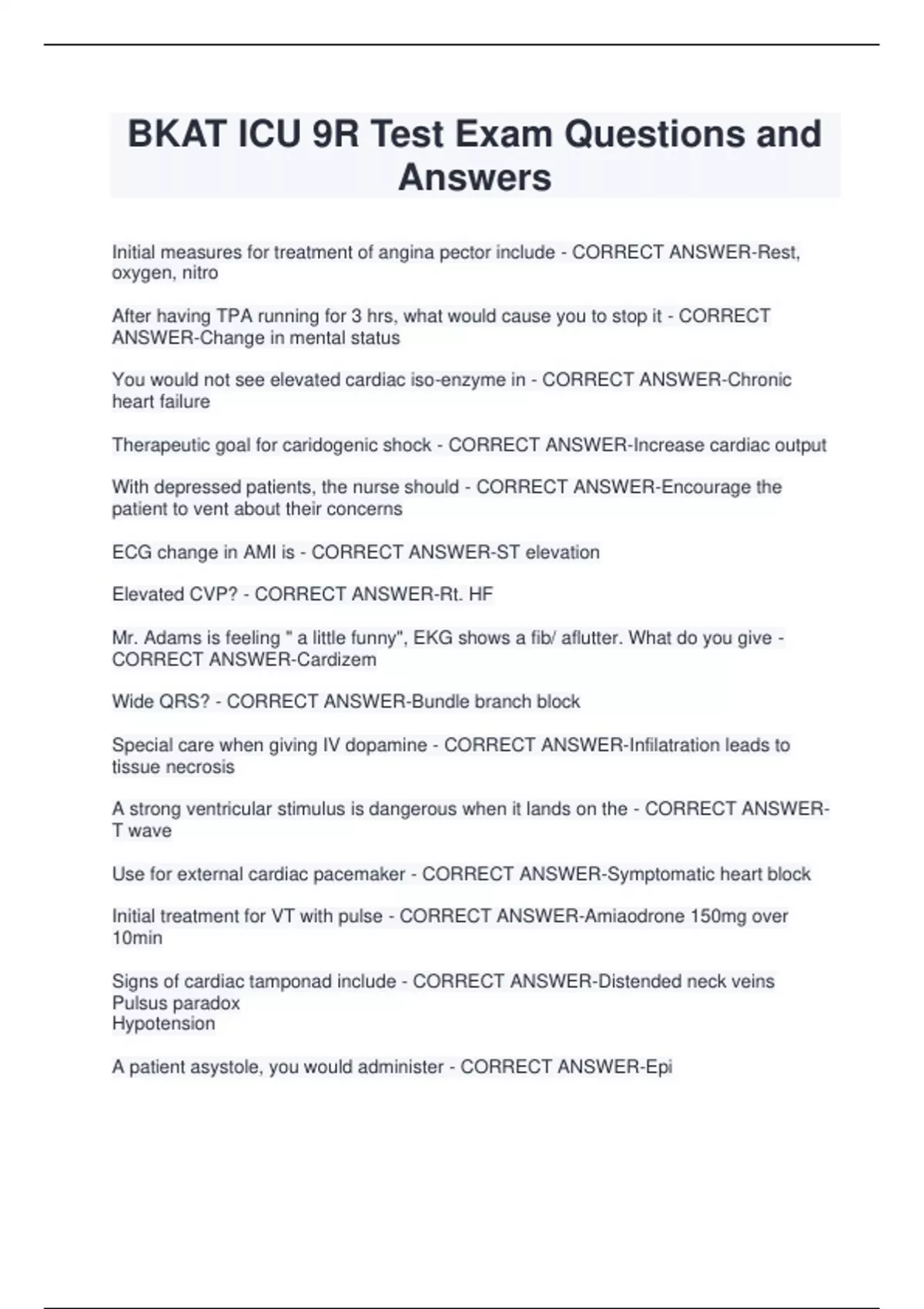 BKAT ICU 9R Test Exam Questions and Answers Initial measures for treatment of angina pector include - CORRECT ANSWER-Rest, oxygen, nitro After having TPA running for 3 hrs, what would cause you to stop it - CORRECT ANSWER-Change in mental status You would not see elevated cardiac iso-enzyme in - CORRECT ANSWER-Chronic heart failure Therapeutic goal for caridogenic shock - CORRECT ANSWER-Increase cardiac output With depressed patients, the nurse should - CORRECT ANSWER-Encourage the patient to vent about their concerns ECG change in AMI is - CORRECT ANSWER-ST elevation Elevated CVP? - CORRECT ANSWER-Rt. HF Mr. Adams is feeling " a little funny", EKG shows a fib/ aflutter. What do you give - CORRECT ANSWER-Cardizem Wide QRS? - CORRECT ANSWER-Bundle branch block Special care when giving IV dopamine - CORRECT ANSWER-Infilatration leads to tissue necrosis A strong ventricular stimulus is dangerous when it lands on the - CORRECT ANSWERT wav