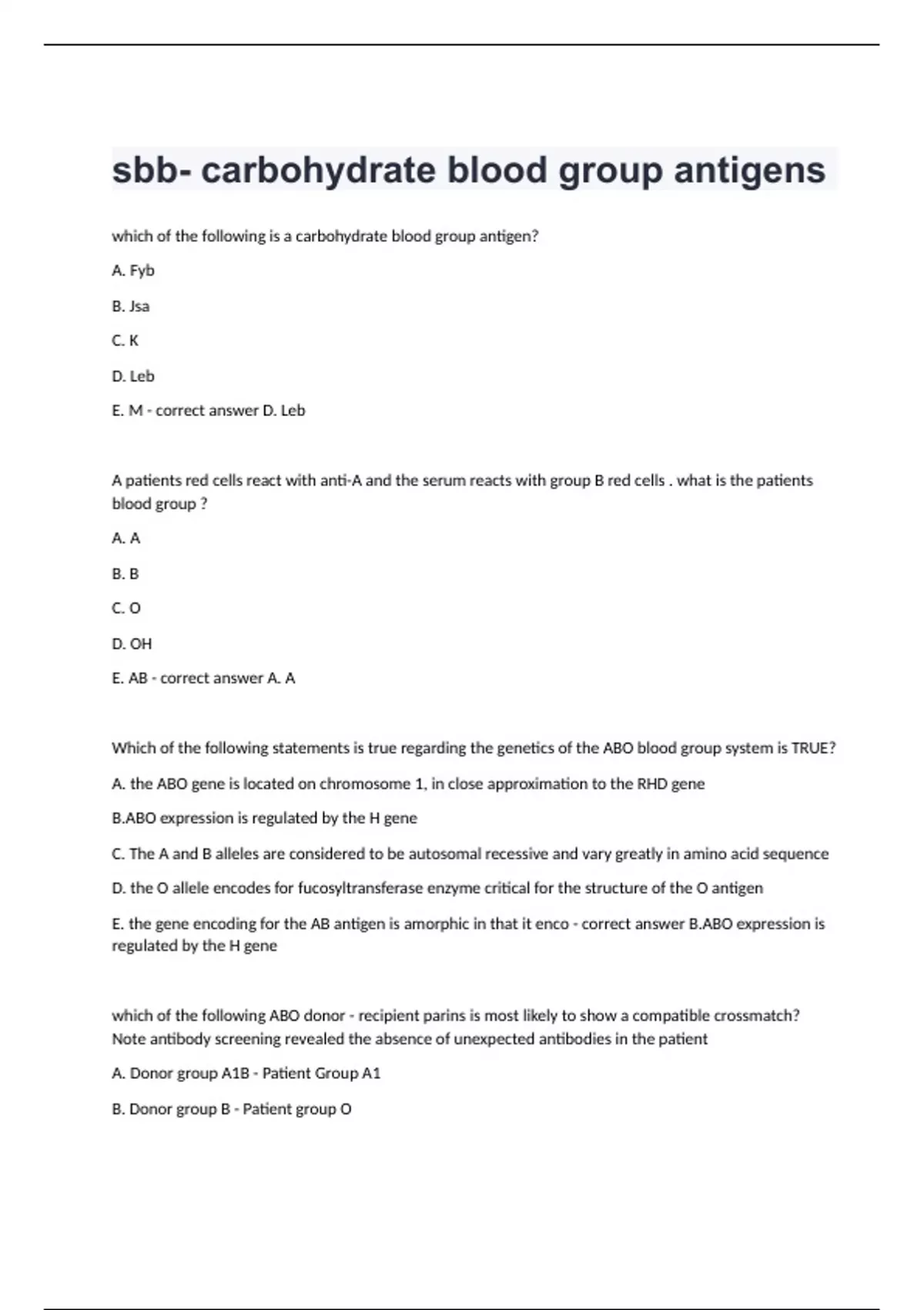 sbb- carbohydrate blood group antigenswhich of the following is a carbohydrate blood group antigen? A. Fyb B. Jsa C. K D. Leb E. M - correct answer D. Leb A patients red cells react with anti-A and the serum reacts with group B red cells . what is the patients blood group ? A. A B. B C. O D. OH E. AB - correct answer A. A Which of the following statements is true regarding the genetics of the ABO blood group system is TRUE? A. the ABO gene is located on chromosome 1, in close approximation to the RHD gene B.ABO expression is regulated by the H gene C. The A and B alleles are considered to be autosomal recessive and vary greatly in amino acid sequence D. the O allele encodes for fucosyltransferase enzyme critical for the structure of the O antigen E. the gene encoding for the AB antigen is amorphic in that it enco - correct answer B.ABO expression is regulated by the H gene which of the following ABO donor - recipient parins is most likely to show a compatible crossmatch? Note antibody screening revealed the absence of unexpected antibodies in the patient A. Donor group A1B - Patient Group A1 B. Donor group B - Patient group O